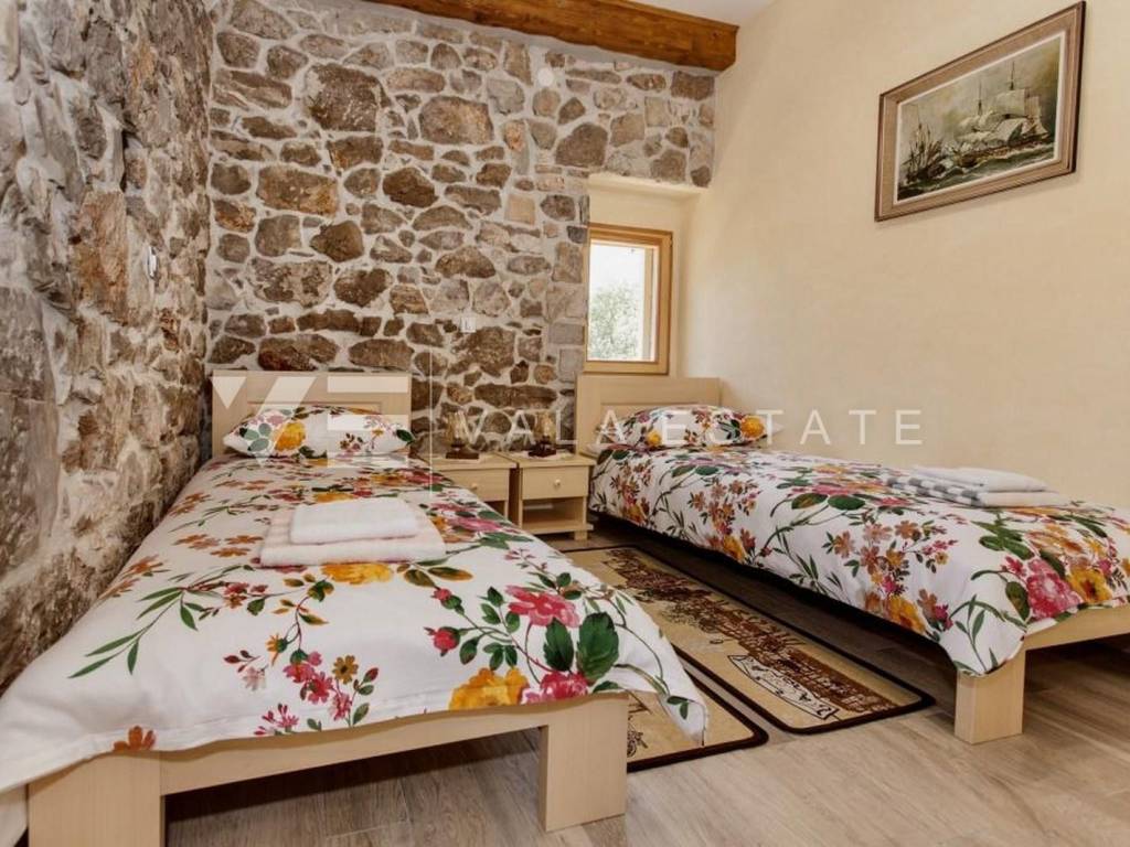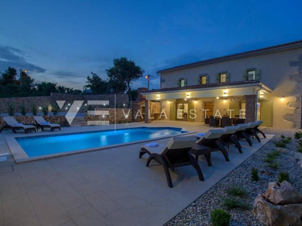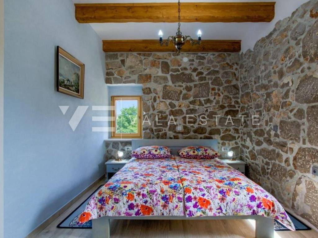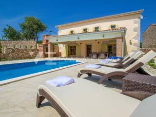 Immobilien Insel Krk, Region Vrbnik - zum Verkauf steht eine freistehende Steinvilla aus dem Jahr 1934, die 2016 komplett renoviert wurde. Die Villa besteht aus einem Erdgeschoss, in dem sich ein Wohnzimmer mit Küche und Zugang zu einer großen überdachten Terrasse befindet, und einem Obergeschoss mit vier Schlafzimmern, jedes mit Bad. Das ganze Haus ist möbliert und wird als solches verkauft und jedes Zimmer ist klimatisiert.Im Garten gibt es Parkplätze für mehrere Fahrzeuge, Schwimmbad mit Heizung, ein Nebengebäude als Lager und einen Garten mit Gartenbau mit automatischer Bewässerung. Die Lage ist ländlich, für alle Liebhaber eines ruhigen Urlaubs, aber auch eine gute Gelegenheit, in eine touristische Vermietung zu investieren.