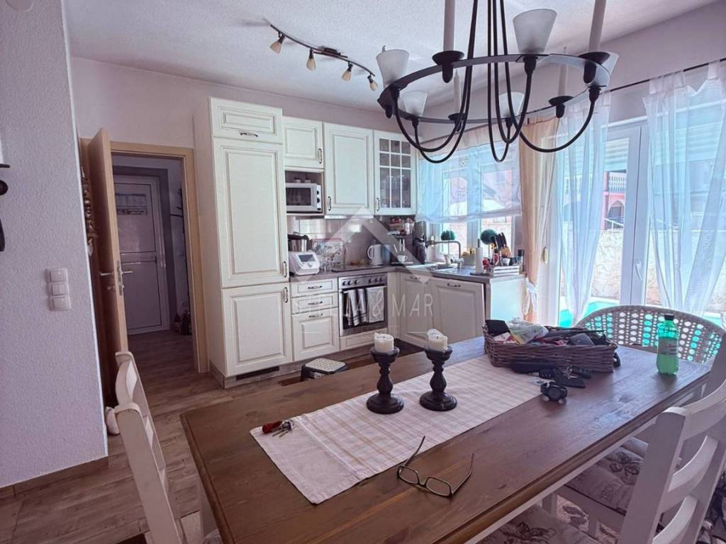 Im Erdgeschoss befindet sich eine komfortable Wohnung von ca. 110 m. Sie besteht aus einem Flur, einem Wohnzimmer mit Küche und Essbereich, einem Gästezimmer mit Bad, zwei Schlafzimmern, einem Badezimmer und einem Abstellraum. Vom Wohnzimmer aus gelangt man in den Garten mit dem Swimmingpool. Der Kamin im Wohnzimmer sorgt an kalten Tagen für angenehme Temperaturen.