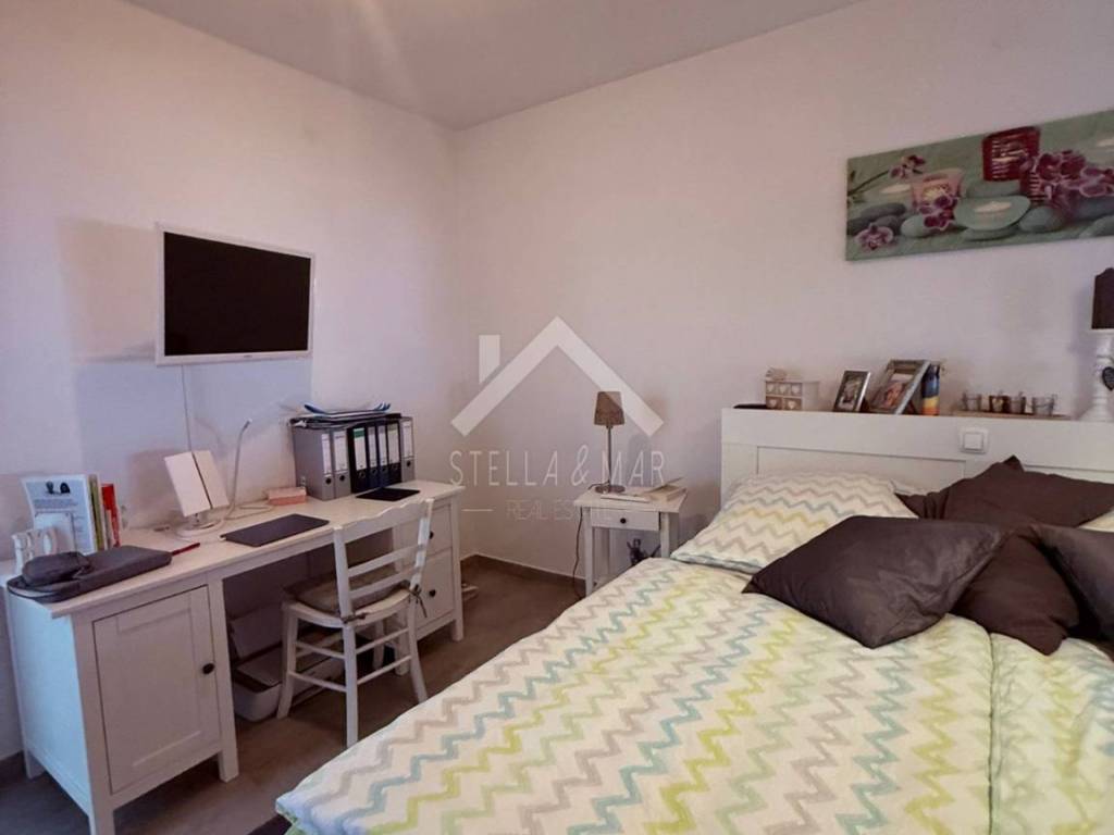 Eine Außentreppe führt in den ersten Stock, wo sich zwei Zwei-Zimmer-Wohnungen befinden. Jede Wohnung verfügt über ein Wohnzimmer mit Küche und Essbereich, zwei Schlafzimmer, ein Badezimmer und eine Terrasse. Alle Zimmer sind klimatisiert.
