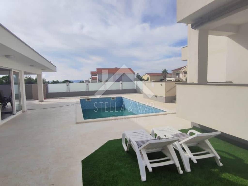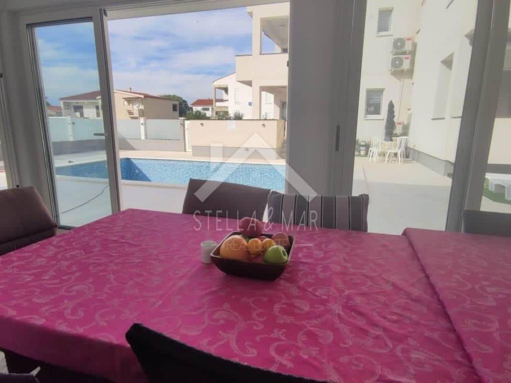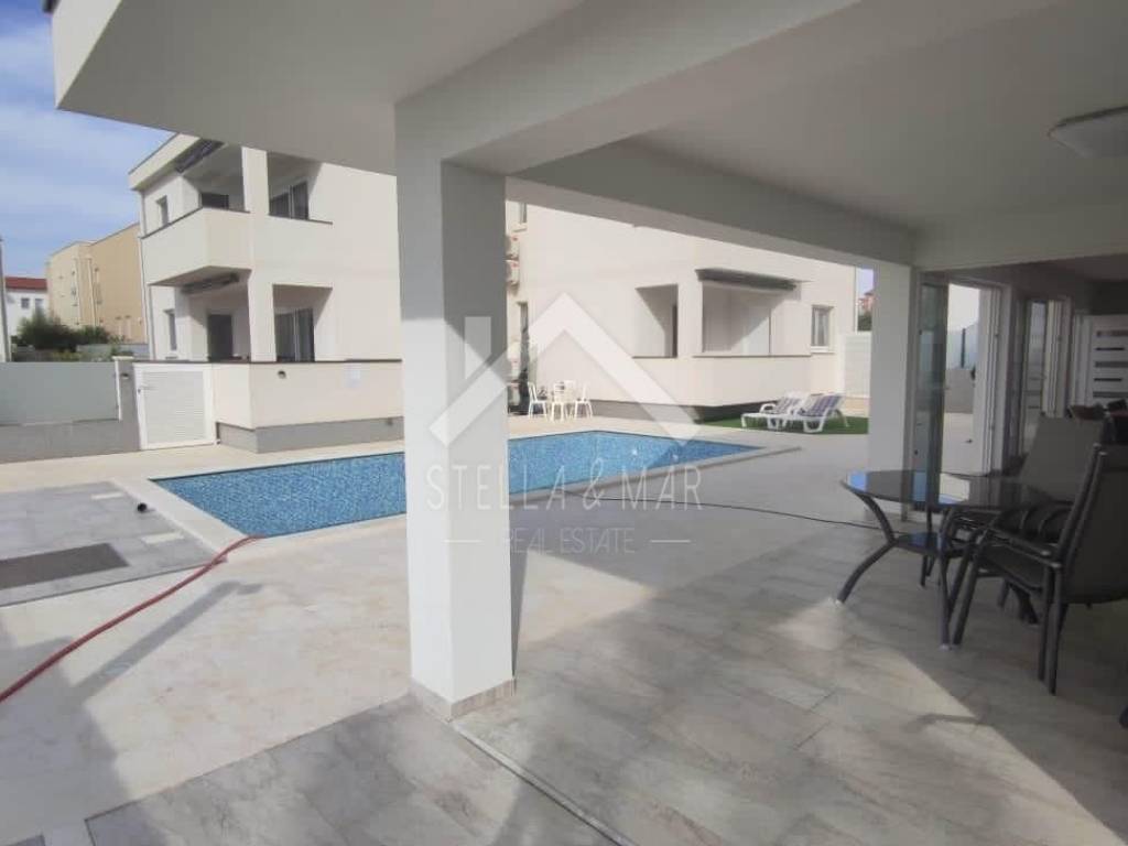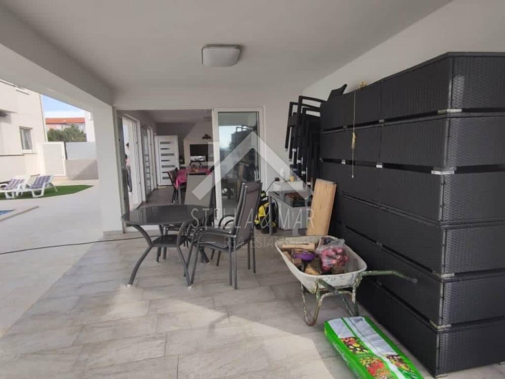 Im Erdgeschoss befindet sich ein großes Apartment mit drei Schlafzimmern, zwei Badezimmern, einem Wohnzimmer mit Küche und einem Esszimmer, das zu einer großen überdachten Terrasse führt.
