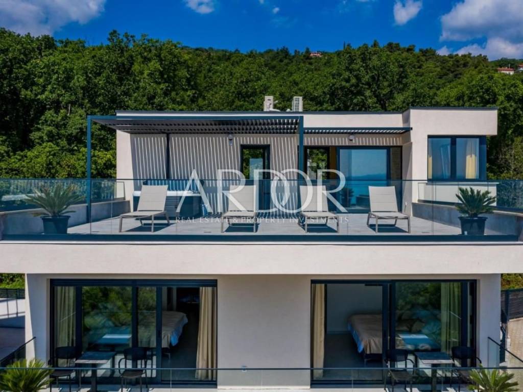 Die moderne Villa befindet sich in einer ruhigen Gegend in der Nähe von Lovran mit einem wunderschönen Panoramablick auf das Meer und die gesamte Kvarner-Bucht, während der nächste Strand nur 5 Autominuten entfernt ist.