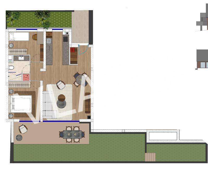 Den besonderen Wert der Wohnung verleihen ein überdachter Eingang, eine Terrasse und ein großer Garten von 36,40 m², der sich perfekt zum Entspannen und Genießen der Privatsphäre eignet.