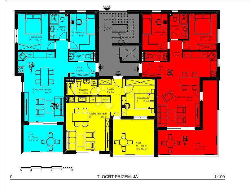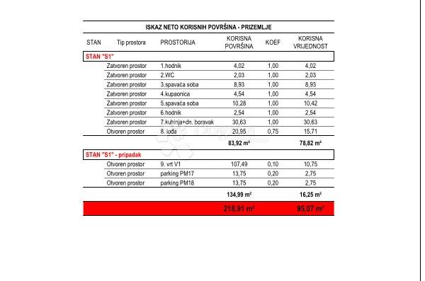 In Ričine, in einem ruhigen Teil von Zadar, in der Nähe von Schulen, Geschäften, Kindergärten und öffentlichen Verkehrsmitteln, befindet sich ein modernes Gebäude mit hoher Energieeffizienz und erstklassiger Bauqualität. Die Mikrolage ist eine Top-Lage in einer gepflegten Straße mit neuerer Bebauung und ordentlichen Parkplätzen. Die Wohnung S1 im Erdgeschoss bietet zwei Schlafzimmer, ein großes Wohnzimmer mit verbundener Küche, ein Badezimmer und eine separate Toilette sowie Flure und einen großen Garten. Die berechnete Nettonutzfläche der Wohnung mit Zubehör beträgt 95,07 m2. Der geschlossene Wohnteil besteht aus einer Küche und einem Wohnzimmer von 30,63 m2, Schlafzimmern von 10,28 m2 und 8,93 m2, einem Badezimmer von 4,54 m2, einer separaten Toilette von 2,03 m2 und Fluren von 4,02 m2 und 2,54 m2. Die Wohnung verfügt über einen Garten V1 von 107,49 m2 und zwei Parkplätze PM17 und PM18 von jeweils 13,75 m2.