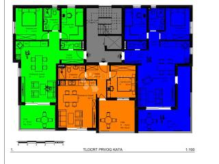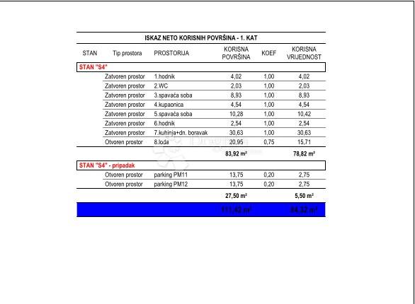 In Ričine, in einem ruhigen Teil von Zadar, in der Nähe von Schulen, Geschäften, Kindergärten und öffentlichen Verkehrsmitteln, befindet sich ein modernes Gebäude mit hoher Energieeffizienz und erstklassiger Bauqualität. Die Mikrolage ist eine Top-Lage in einer gepflegten Straße mit neuerer Bebauung und ordentlichen Parkplätzen. Die Wohnung S4 im ersten Stock bietet zwei Schlafzimmer, ein großes Wohnzimmer mit angeschlossener Küche, ein Badezimmer, eine separate Toilette und Flure. Die berechnete Nettonutzfläche der Wohnung mit Zubehör beträgt 84,32 m2. Der geschlossene Wohnteil besteht aus einem Wohnzimmer mit Küche von 30,63 m2, Schlafzimmern von 10,28 m2 und 8,93 m2, einem Badezimmer von 4,54 m2, einer separaten Toilette von 2,03 m2 und Fluren von 4,02 m2 und 2,54 m2. Die Wohnung verfügt über eine Loggia von 20,95 m2 und zwei Parkplätze PM11 und PM12 von jeweils 13,75 m2.