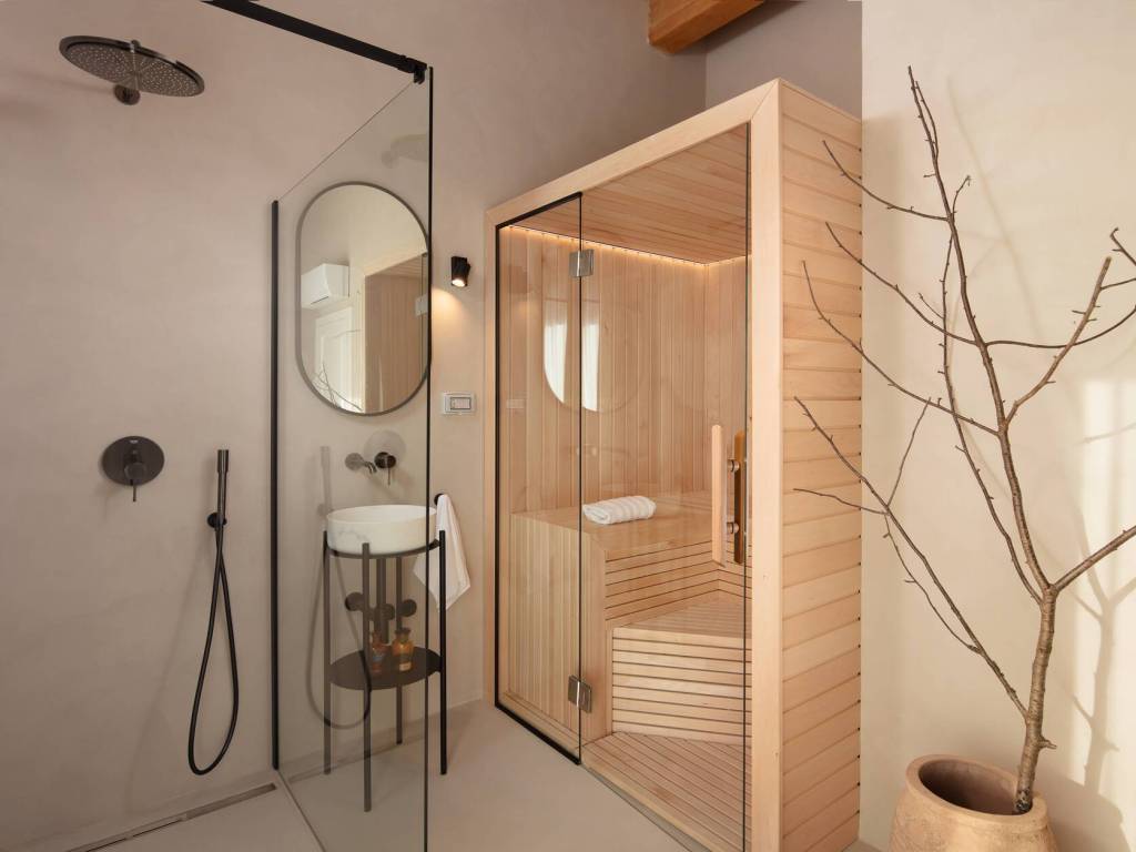 Obergeschoss: Flur, vier elegant gestaltete Schlafzimmer jedes mit eigenem Bad sowie ein exklusiver Wellnessbereich für Momente vollkommener Entspannung.