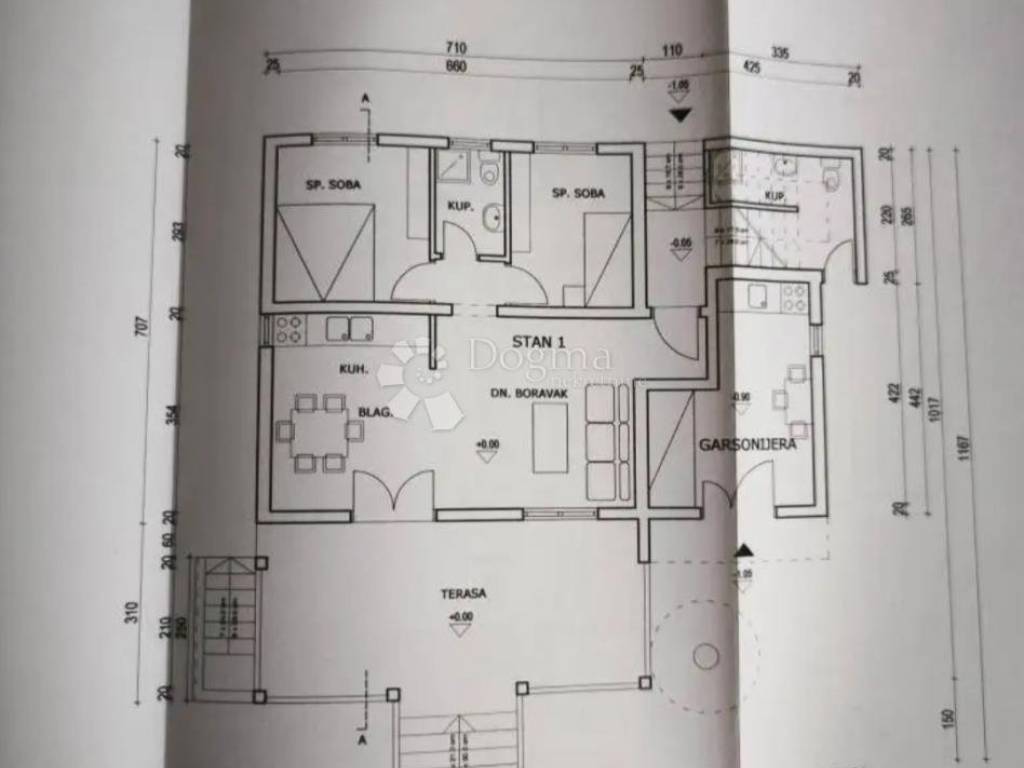 Zum Verkauf steht ein wunderschönes Haus mit einer Gesamtfläche von 182 m, gelegen in einer ruhigen Umgebung mit ausgeprägtem mediterranem Flair, nur wenige Gehminuten vom Meer entfernt. Dieses einzigartige Anwesen verfügt über vier separate Wohneinheiten und eignet sich daher ideal als touristische Investition oder als Ferienhaus.