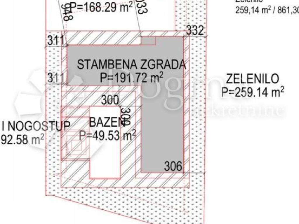 Es erstreckt sich über zwei Etagen, Wohnfläche cc. 385 m2, Parkplatz 170 m2, Schwimmbad 49,50 m2 und Gartenanlage 260 m2.
