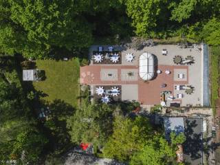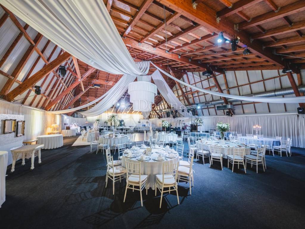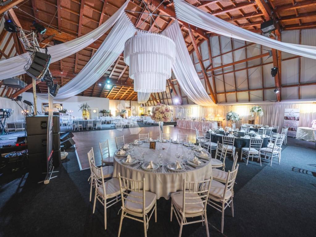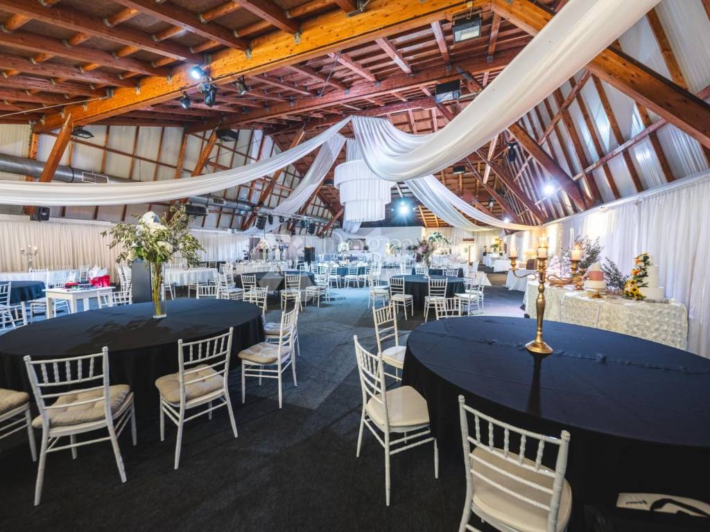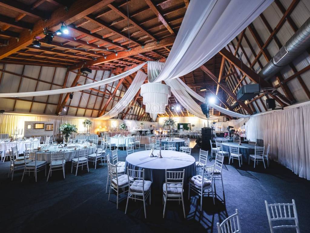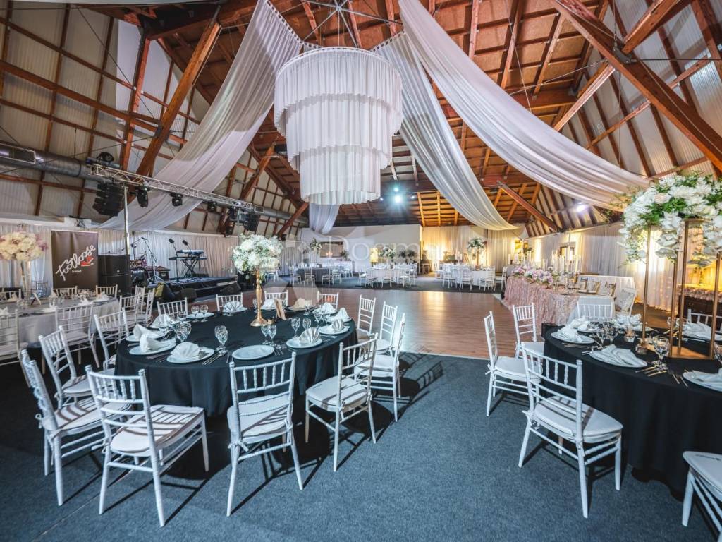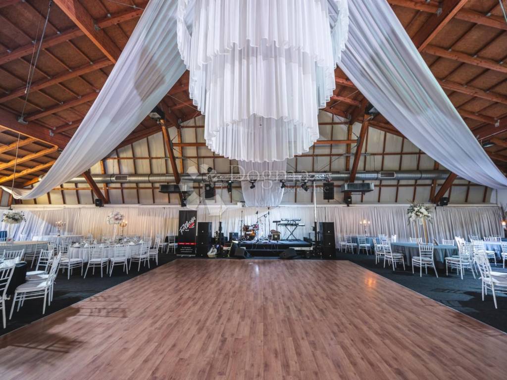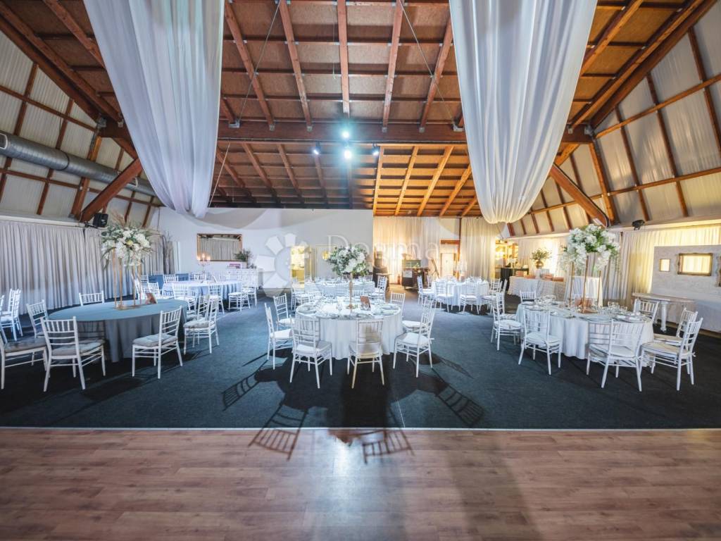 Ein wunderschöner Saal, der die Wärme von Holzelementen ausstrahlt, angereichert mit weißen Details und einem prächtigen Kronleuchter. Der säulenlose Saal ist 612 Quadratmeter groß und bietet Platz für 130 bis 400 Gäste. Keine Säulenbeschränkungen, hier können Sie die Gäste frei anordnen, während die großzügige Tanzfläche für einen Hauch von Eleganz sorgt.