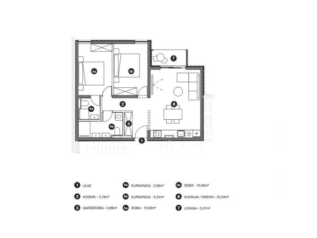 Auf der Insel Hvar, in einer ruhigen und gepflegten Siedlung, die für ihre geschützte Bucht und ihren Yachthafen bekannt ist, entsteht ein neues Wohnprojekt mit insgesamt 16 Wohnungen. Im ersten Stock des Gebäudes A befindet sich die Wohnung S4. Sie besteht aus einem Flur mit Garderobe, einem offenen Wohnzimmer mit angeschlossener Küche und Esszimmer sowie einem Ausgang zur Loggia. Daran schließt sich ein Flur an, der zu zwei Schlafzimmern und zwei Bädern führt. Für die Bauausführung wurden hochwertige Materialien verwendet: Stahlbetonkonstruktion, wärmegedämmte Fassade, Dreifachverglasung, elektrische Rollläden, Fußbodenheizung in den Bädern, Klimaanlage und hochwertige Keramik. Das Projekt umfasst Außenparkplätze, die teilweise überdacht sein werden. Die Fertigstellung ist für Sommeranfang 2026 geplant. Das Projekt befindet sich in ruhiger Lage, nur 300 Meter vom Meer entfernt und in der Nähe aller wichtigen Annehmlichkeiten – Geschäfte, Restaurants, Cafés, Yachthafen und Promenade. Aufgrund seiner Lage und der angenehmen Umgebung ist es eine hervorragende Option für ganzjähriges Wohnen, aber auch eine sichere Investition für die touristische Vermietung. * Preis inklusive Mehrwertsteuer – der Käufer ist nicht grundsteuerpflichtig.