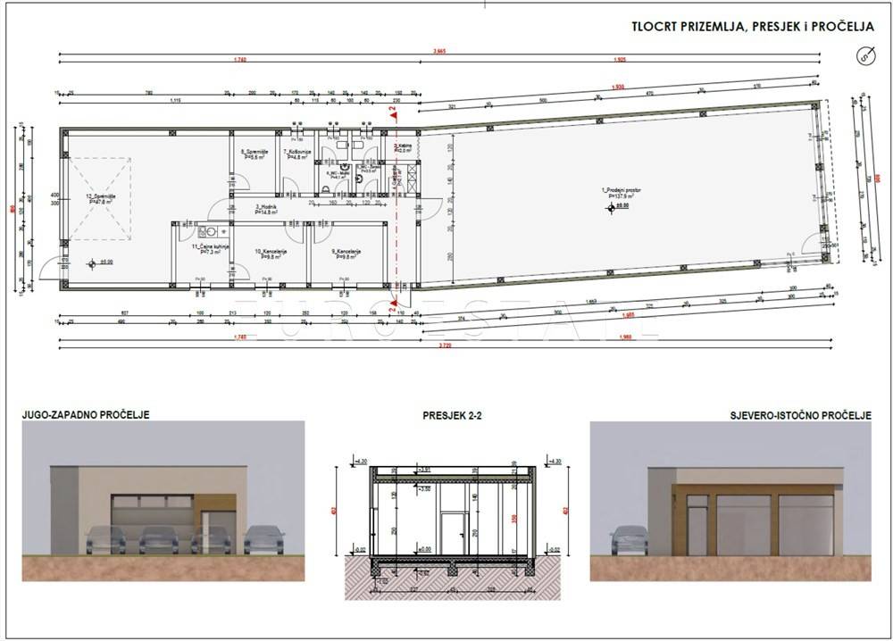 - oglašena cijena obuhvaća i građevinski projekt sa građevinskom dozvolom i plaćenim doprinosima za gradnju poslovne prizemne zgrade površine 300 m2,