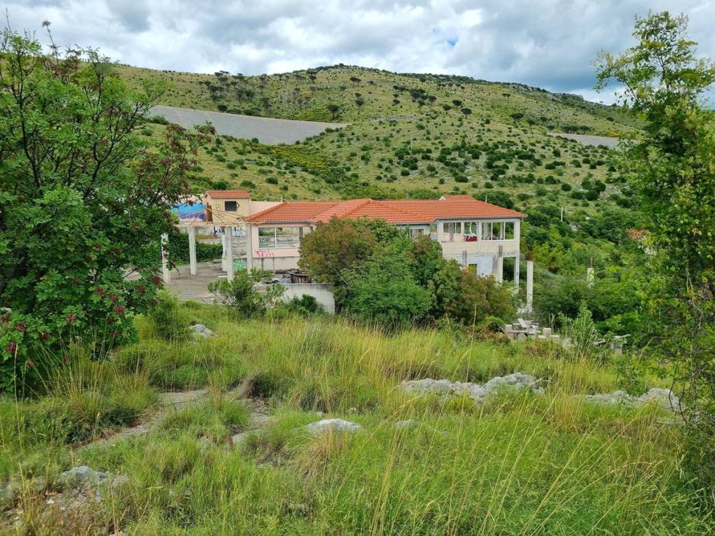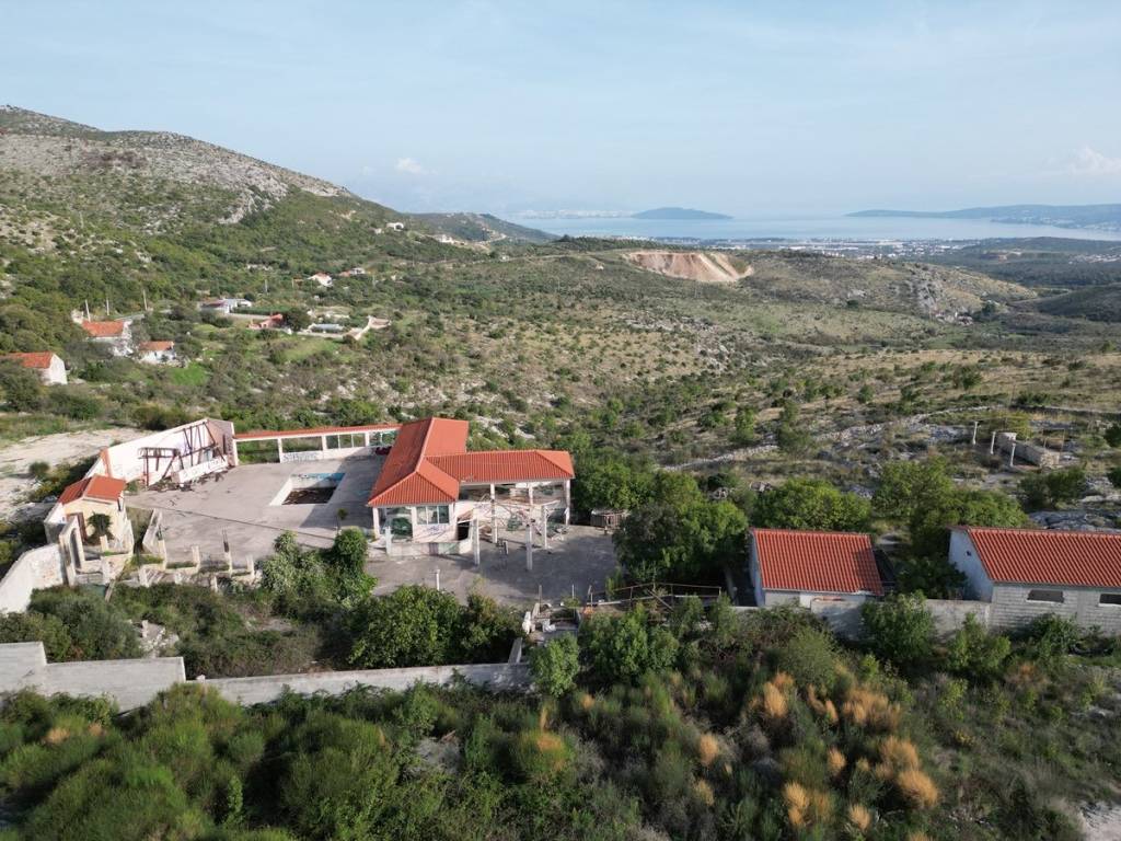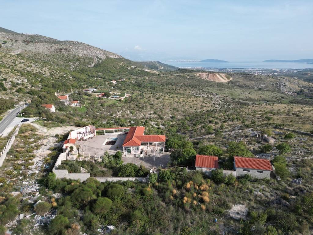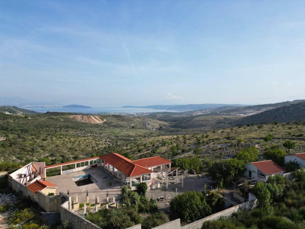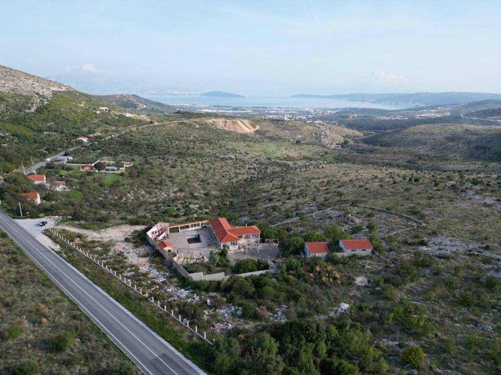 Prodaje se prostrano građevinsko zemljište od 5841 m2 u naselju Plano, nedaleko od grada Trogira. Na zemljištu se nalaze ugostiteljski objekti legalizirani kao disco club, katnosti: suteren + prizemlje i pomoćni objekt u prizemlju ukupne bruto građevinske površine od 374,57 m2, zatim caffe bar s pomoćnim objektom (sanitarije) s bruto građevinskom površinom od 91.08 m2. Naknadnim projektom za rekonstrukciju, ovaj objekt je prenamijenjen u salu za vjenčanja. Objekt trenutno nije u funkciji, već je u ruševnom stanju, zahtijeva kompletnu obnovu ili izgradnju u potpunosti novog objekta.Zemljište se nalazi na izuzetnoj lokaciji, na mirnom, izoliranijem području, ali i na višem položaju s kojeg se pruža prekrasan nezaklonjiv pogled na more i okolicu.Do zemljišta vodi glavna prometnica, priključak struje je na zemljištu, ali i septička jama za odvodnju otpadnih voda.Prema prostornom planu, ono se nalazi unutar neizgrađenog građevinskog područja naselja. U smislu zakona o prostornom uređenju, ne postoji obveza izrade urbanističkog plana uređenja, što znači da se na zemljištu može odmah pristupiti predavanju zahtjeva za građevinsku dozvolu. Na građevinskoj čestici može se graditi stambena ili stambeno-poslovna građevina i pomoćne građevine, kao i gospodarske građevine.Udaljenost od mora i grada Trogira 7 km, od zračne luke Split 8 km, a od izlaza na autocestu 9 km.