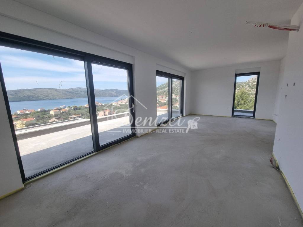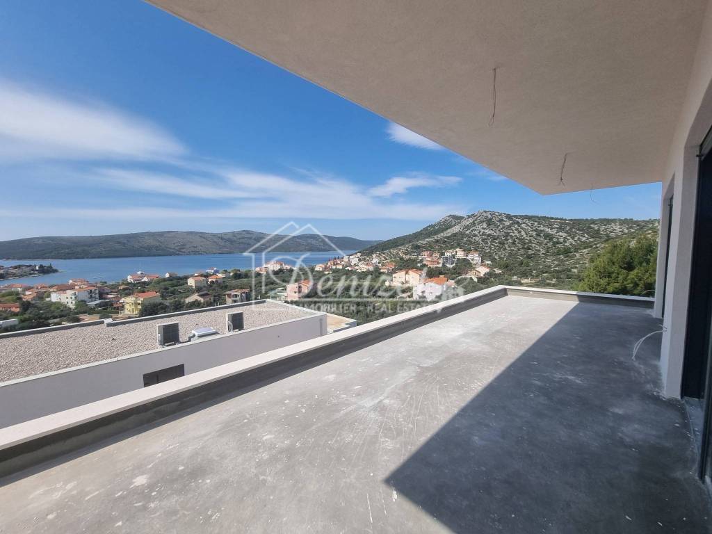 Im Obergeschoss befindet sich eine Wohnung mit 71 m² mit zwei Schlafzimmern, Wohnzimmer, Küche, Esszimmer und Badezimmer. Ein Schlafzimmer hat Zugang zu einem kleineren Balkon von 5 m², während das Wohnzimmer Zugang zu einem großzügigen Balkon von 39 m² mit wunderschönem, offenem Meerblick hat.