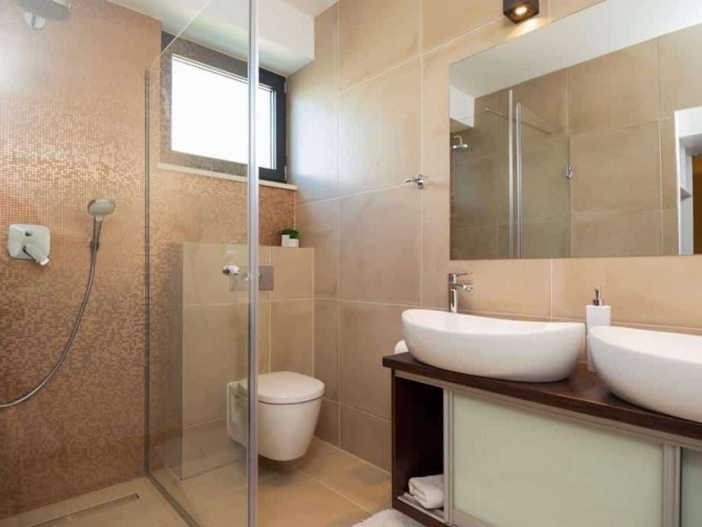 For sale is newly build luxury villa on Island Čiovo. With totali 6 bedrooms and 7 bathrooms villa has 300 sq.m. of living area on a land plot of 550 sq.m. On the ground floor there is wellness – zone with indoor pool, sauna, fitness room and an activity room with pool billiards. The indoor pool is equipped with counter – current swimming system and heating. The outdoor pool is 21 sq.m. large. On the upper floors are situated living room, kitchen, dining room, bedrooms and bathrooms. Spacious terraces offering view of  the sea and mountains. Bellow the villa is pebble beach. Villa is completely furnished and equipped and sold like that. Distance to Trogir 5 km, to International airport Split 10 km.