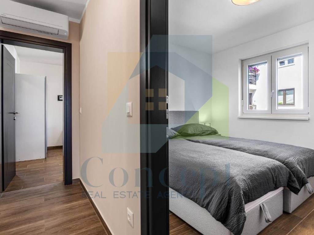 Das Gebäude wurde 2023 erbaut und die Wohnung besteht aus zwei Schlafzimmern, von denen eines ein eigenes Badezimmer hat, einem zusätzlichen Badezimmer sowie einem geräumigen, offen gestalteten Wohnzimmer mit Küche und Essbereich. Die Wohnung ist mit Fußbodenheizung im gesamten Bereich ausgestattet und verfügt außerdem über Klimaanlagen zur Kühlung.