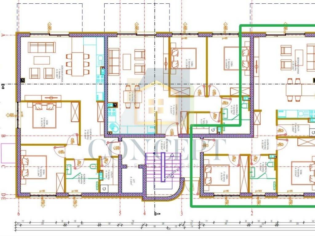 Die Wohnung hat eine Gesamtfläche von 71,46 m und besteht aus einem Eingangsflur, einem Abstellraum, einem modernen Badezimmer, zwei Schlafzimmern und einem geräumigen Wohnzimmer, das mit der Küche und dem Essbereich verbunden ist. Aus dem Wohnbereich führen zwei Ausgänge zu einem gemeinsamen Innenhof, der zusätzlichen Raum zum Entspannen und Genießen im Freien bietet.