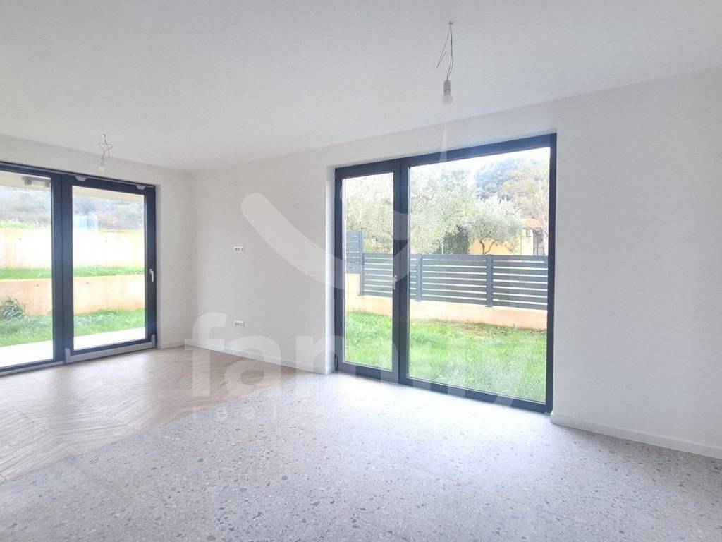 Das oben genannte moderne und hochwertige kleine Wohngebäude eines bewährten Investors mit insgesamt 8 Wohneinheiten befindet sich in der attraktiven Lage von Banjole. Die oben genannte 60,49 m2 große Wohnung befindet sich im Erdgeschoss und besteht aus einem Eingangsbereich mit einbruchsicherer Eingangstür, einem hellen und komfortablen Schlafzimmer mit Zugang zu Terrasse und Garten, einem geräumigen Wohnzimmer mit Anschluss an eine offene Küche und Zugang zu Terrasse und Garten (6,51 m2) sowie einem Badezimmer mit Geberit-Einbauspülkasten, ebenerdiger Dusche, Installationen für eine Waschmaschine, einem Ariston-Heizkessel und einer Lüftungsanlage. Die Böden in der gesamten Wohnung sind mit hochwertiger Keramik ausgelegt, und das Schlafzimmer ist mit Sherborne-Keramik in Holzoptik ausgestattet. Das Heiz- und Kühlsystem wird durch zwei Klimaanlagen von Mitsubishi geregelt, eine im Schlafzimmer und eine im Wohnzimmer. Im gesamten Gebäude wurde außerdem eine elektrische Fußbodenheizung mit separaten WLAN-Thermostaten in jedem Zimmer installiert. Es wurden PVC-Tischlereien mit dreifach verglastem Anthrazitglas und Aluminium-Rollläden mit elektrischen Aufzügen eingebaut, außerdem wird ein anthrazitfarbener Gartenzaun aus Aluminium errichtet. Das Gebäude ist im Erdgeschoss mit einer 8 cm dicken Thermofassade ausgestattet, in der zusätzlich 2 cm dicker Travertino Classico-Stein verbaut wurde, was sicherlich zu einer hervorragenden Wärme- und Schalldämmung beiträgt. Zur Wohnung gehören ein nicht überdachter Parkplatz sowie eine Gemeinschaftstoilette im Flur des Gebäudes, das allen Mitmietern gehört. Die Arbeiten sollen bis Ende 2025 abgeschlossen sein.