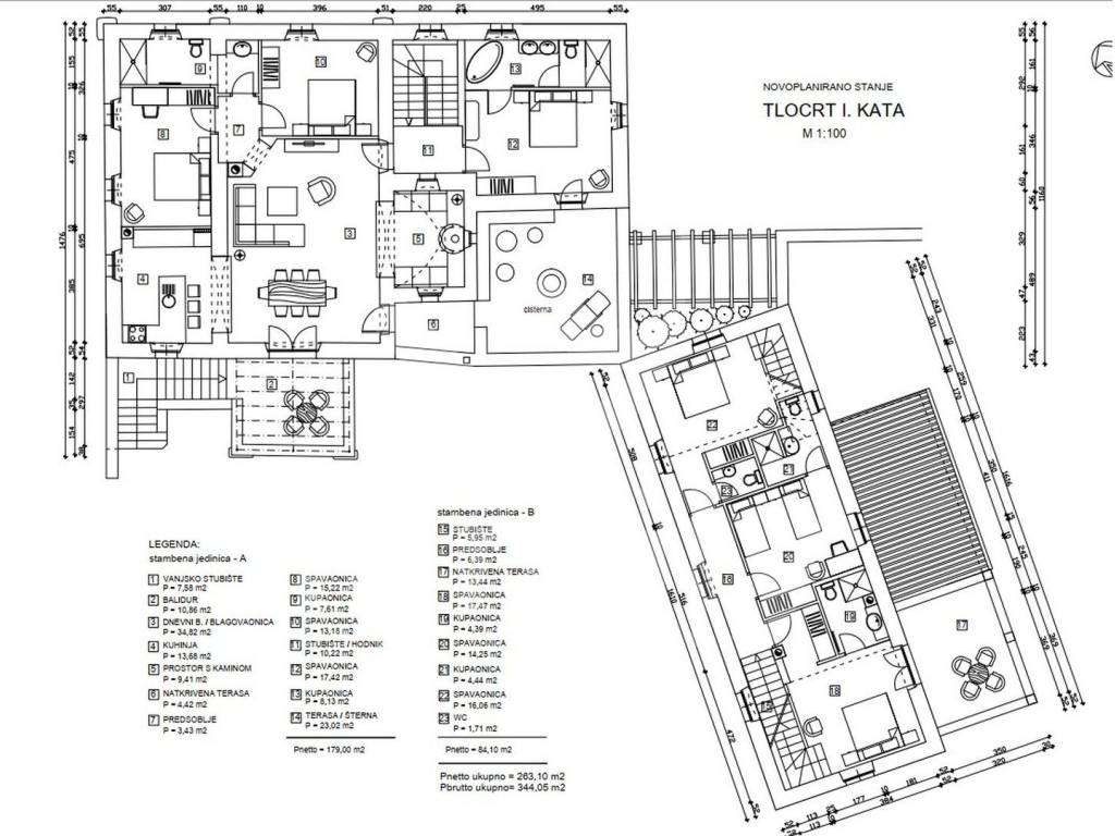 Gemäß dem vorgeschlagenen Projekt umfasst das Erdgeschoss des Gebäudes einen überdachten Eingang, zwei Küchen, eine Taverne, einen Lagerraum, einen Weinkeller, zwei Toiletten, zwei Badezimmer, eine Waschküche, einen Fitnessraum, einen Heizraum usw Wohnzimmer mit Esszimmer, zwei Schlafzimmer mit einem Nebengebäude, das als Sommerküche mit Abstellraum und Toilette dienen soll. Die erste Etage würde aus einem Flur, einem Wohnzimmer mit Esszimmer, einer Küche, einem Raum mit Kamin, einer überdachten Terrasse, einer Terrasse mit Patio, sechs Schlafzimmern, einer Toilette und vier Badezimmern bestehen. Im Dachgeschoss der Immobilie würde es eine Galerie geben, die aus einer Treppe, einem Schlafzimmer, einem Badezimmer, einem Ankleidezimmer und einem Ruhebereich bestehen würde.