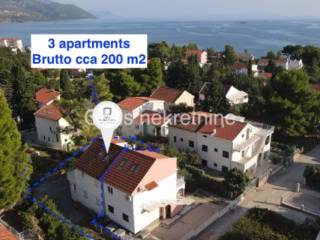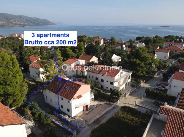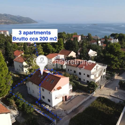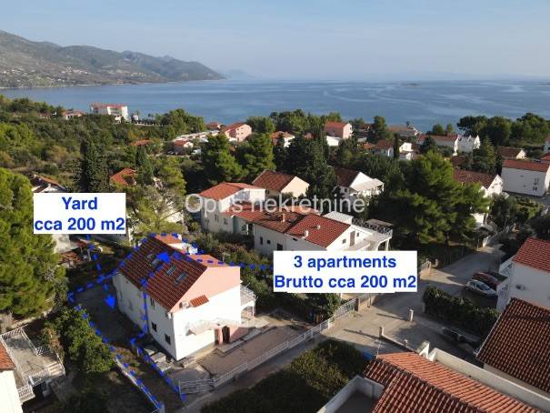 Prodaje se kuća cca 200 m2 s apartmanima u mjestu Orebić na Poluotoku Pelješcu. Kuća je smještena na mirnoj lokaciji, udaljena svega 300 m od mora. Sastoji se od prizemlja i 2 kata, svaka jedinica je zasebni apartman s prekrasnim pogledom na more. Ispred kuće prostran vrt od cca 200 m2 i privatan prilaz objektu. Odlična investicijska prilika.