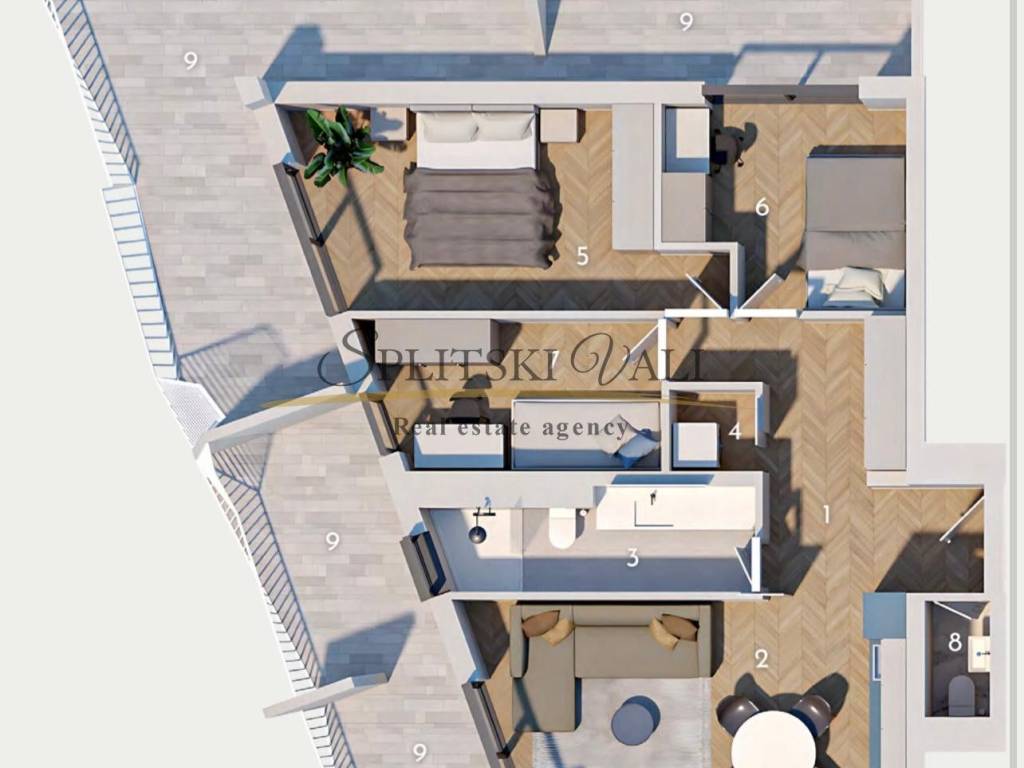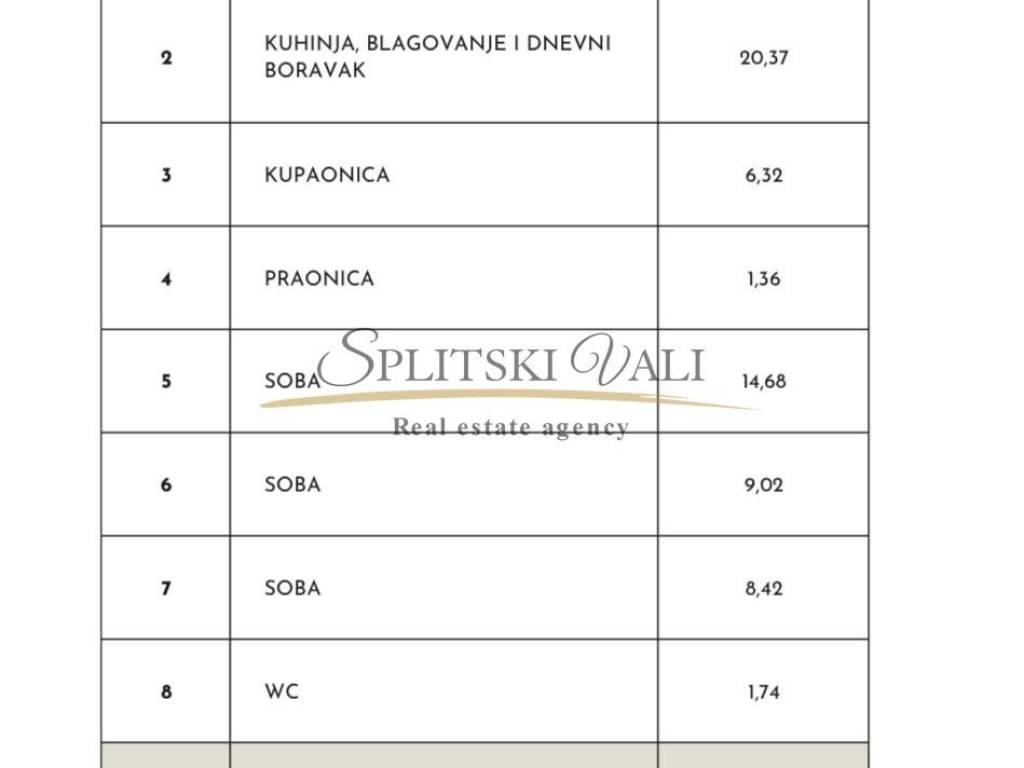 Sastoji se od hodnika, dnevnog prostora s kuhinjom i blagovaonicom, praonice,kupaonice, WCa, tri spavaće sobe te prostranog balkona od 36,79 m2.