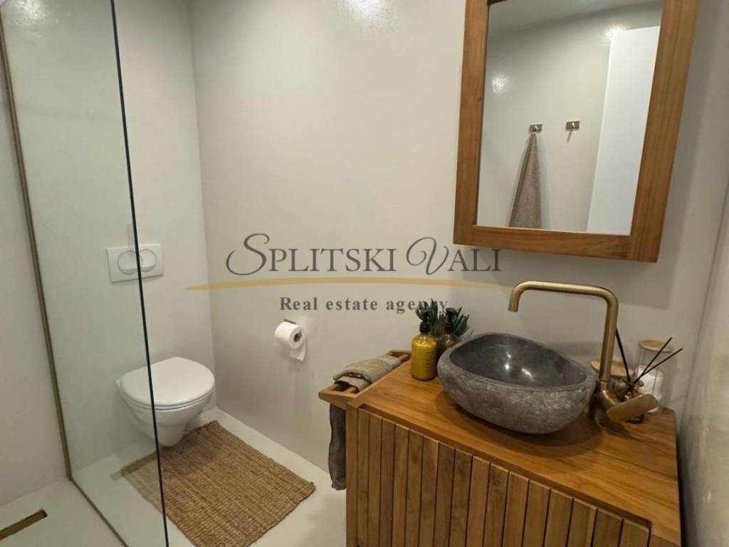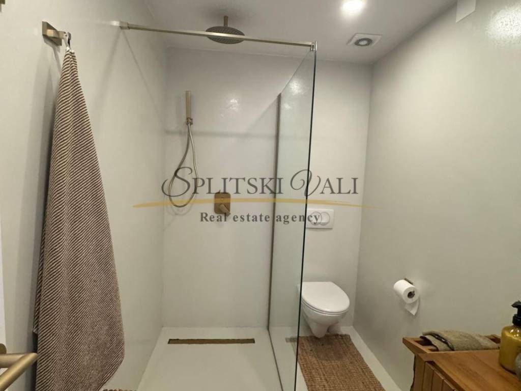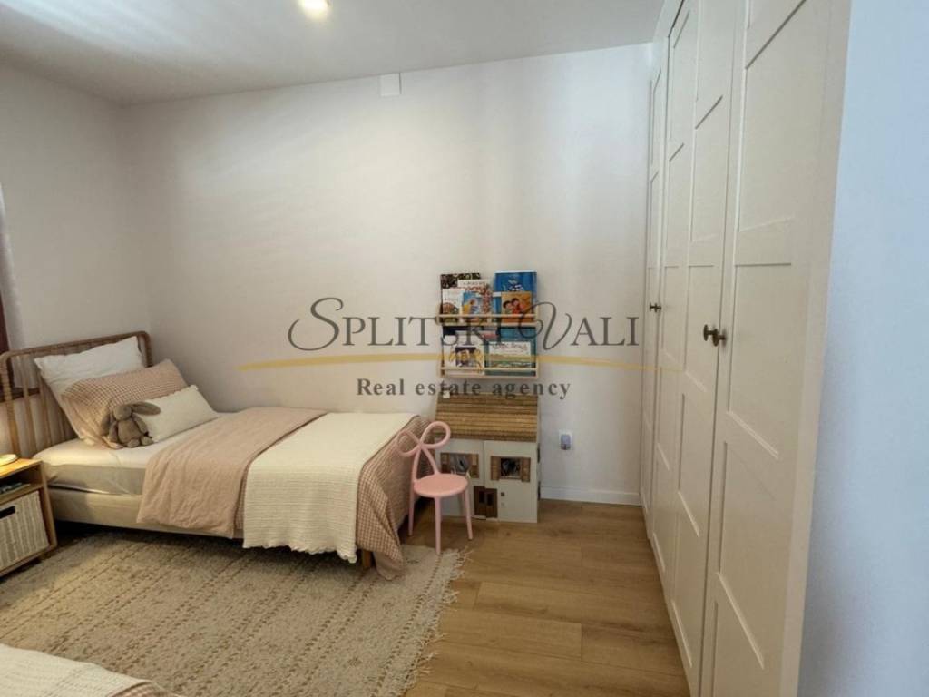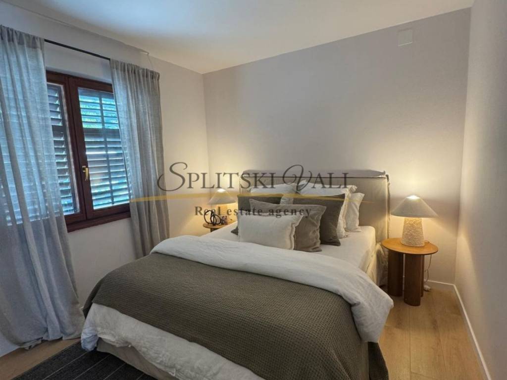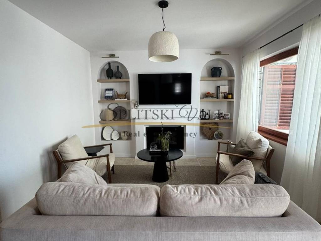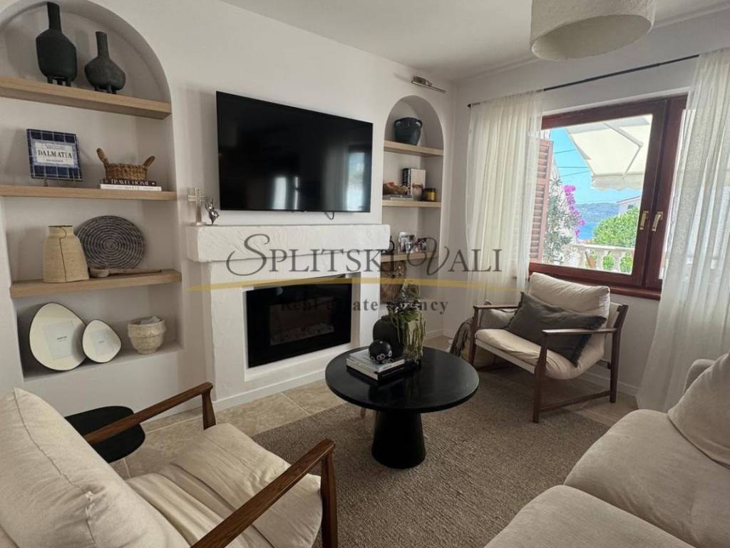 U prizemlju se nalazi kuhinja s blagovaonicom i dnevnim boravkom, tri prostrane spavaće sobe, kupaonica te natkrivena terasa s pogledom na more. Na katu su smještena dva samostalna apartmana, svaki s vlastitim ulazom i također s pogledom na more.