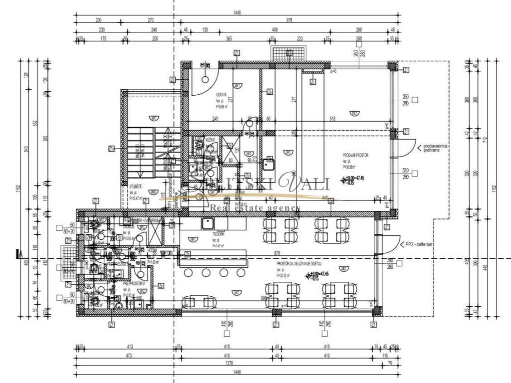 Poslovni prostor 2 sastoji se od hodnika, pretprostora, točionika, prostora za posluživanje gostiju, sanitarnog čvora za osoblje te pretprostora i sanitarnih čvorova za žene i muškarce s 52.56 m2 ukupne površine kao i podrumska ostava od 54.28 m2 što obračunski iznosi 79.70 m2 neto poslovnog prostora. Namijenjen je uslužnoj djelatnosti. Prostor ima vlastiti ulaz i zasebni ulaz u podrumsku ostavu.