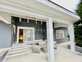 Die Villa ist lichtdurchflutet und aus hochwertigen Materialien gebaut, darunter ALU-Fenster, zentrale Gasheizung, elektrische Rollläden, Alarmanlage und Videoüberwachung. Die Fassade ist mit Travertin verkleidet, und im Rahmen der umfassenden Renovierung im Jahr 2018 wurden ein neues Dach, Parkettböden, ein Badezimmer mit Sauna und eine voll ausgestattete Bosch-Küche installiert. Die großzügige Terrasse ist mit Designer-Gartenmöbeln ausgestattet, und neben der Garage gibt es zwei weitere Parkplätze im Innenhof.