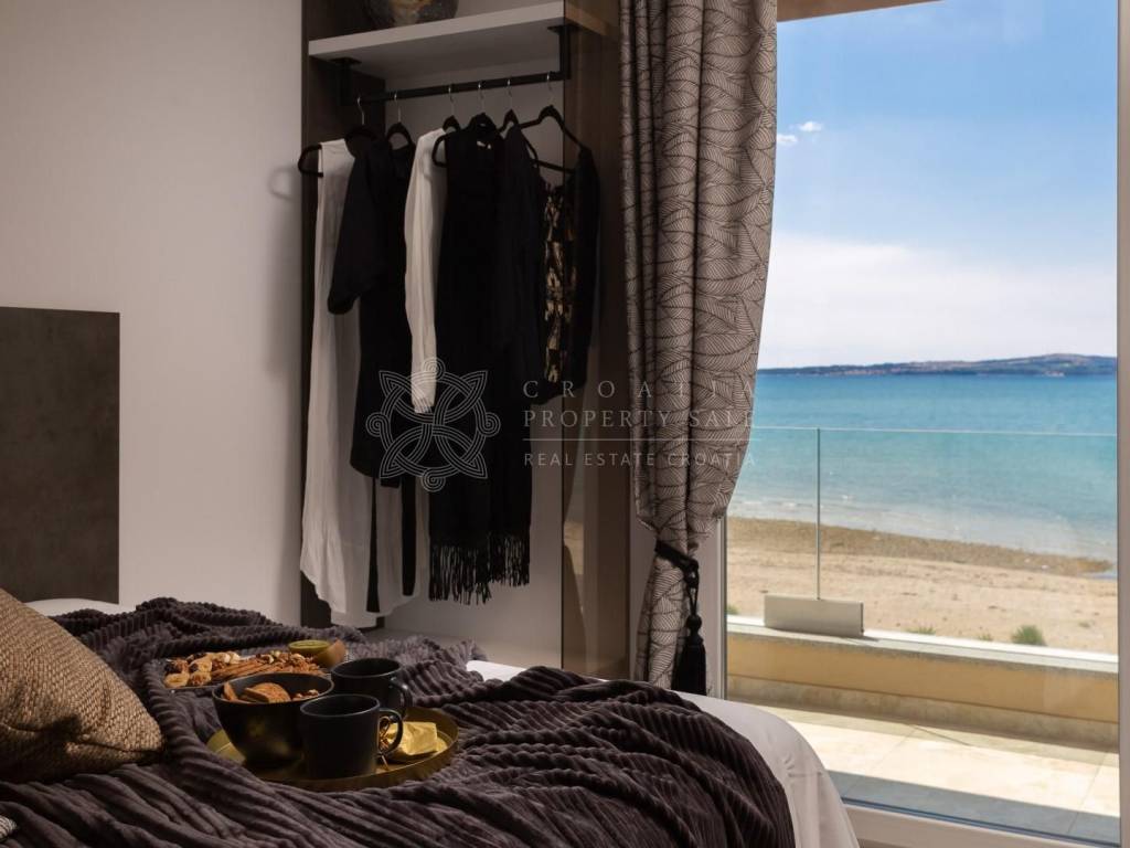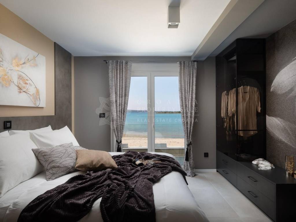 Croatia Zadar area Modern seafront villa with pool for sale is is located directly on the waterfront, with no road separating the villa from the sea. Newly built and designed with a contemporary flair, it offers breathtaking sea views, especially during the evenings when the sky is painted with stunning sunsets. This spectacular view can be enjoyed from every room, the spacious terraces, and the pool area.The villa features a minimalist design and is fully furnished, offering 174 square meters of living space on a 540 square meter plot. Situated in the first row to the sea, in a peaceful area near Zadar, the villa is spread over two floors. The ground floor includes a kitchen, dining area, living room, toilet, an internal staircase, and a garage located at the back. The kitchen and dining area lead out to an outdoor terrace with a large dining table, chairs, and a BBQ. The spacious terrace also features an outdoor pool, sunbeds, and stunning panoramic sea views, perfect for watching the sunset. On the upper floor, there are three bedrooms, each with an en-suite bathroom and access to a large terrace.Located away from the village, the villa offers privacy, while shops and restaurants are just a short drive away. The advantage of this location is the direct access to the beach, and since the area is sparsely populated, there are no close neighbors. Price for this modern seafront villa with a pool is available on request.