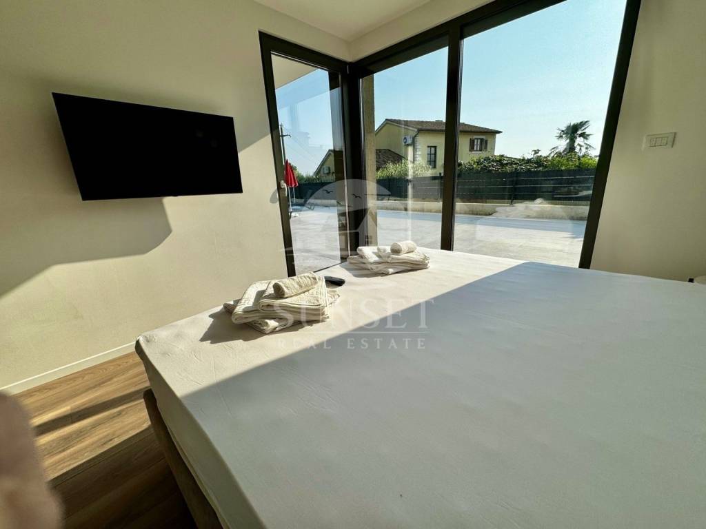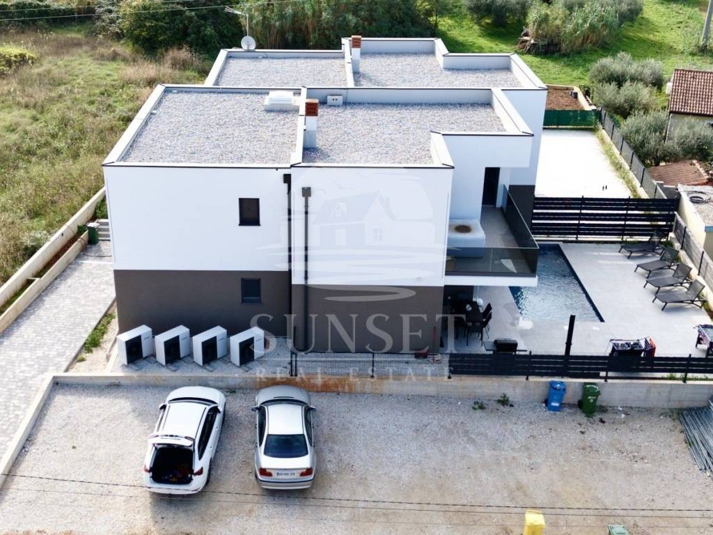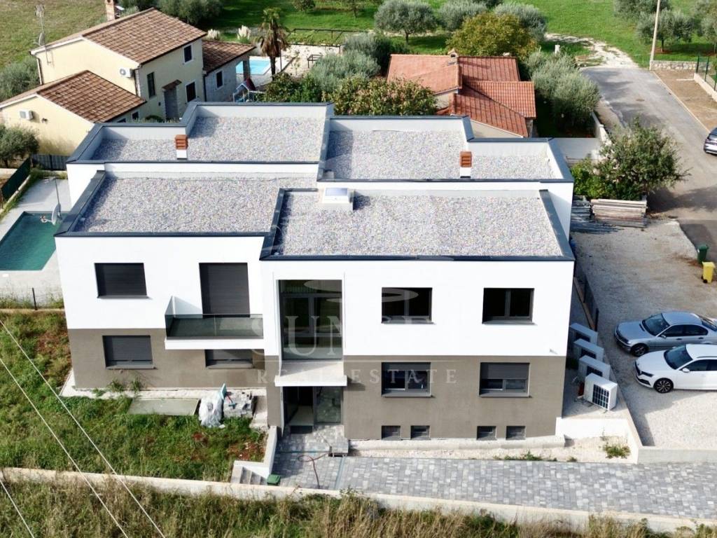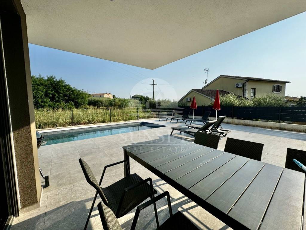 In der Nähe von Poreč befindet sich ein modernes, neu erbautes Gebäude mit luxuriösen Wohnungen und Meerblick. Diese Erdgeschosswohnung befindet sich in einem Gebäude mit nur vier Wohneinheiten und hat eine Gesamtfläche von 100,46 m. Sie besteht aus einem Eingangsbereich, drei geräumigen Schlafzimmern, zwei Bädern und einer zusätzlichen Gästetoilette. Das Wohnzimmer, der Essbereich und die Küche sind im offenen Konzept gestaltet, was den Raum noch großzügiger wirken lässt, und führen auf eine 15,63 m große Terrasse. Der gesamte Wohnbereich öffnet sich zu einer überdachten Terrasse mit einem privaten beheizten Pool, ausgestattet mit einer Trennwand für Privatsphäre.