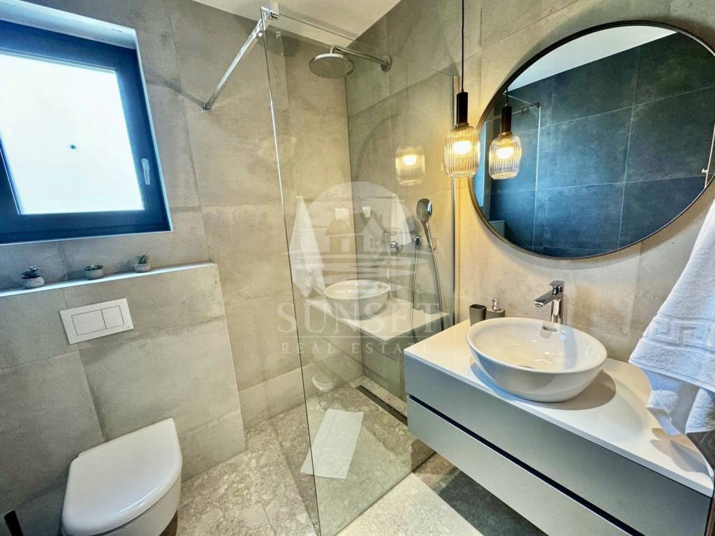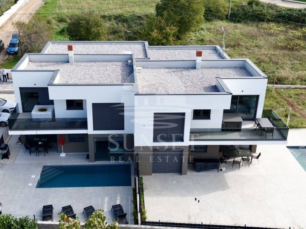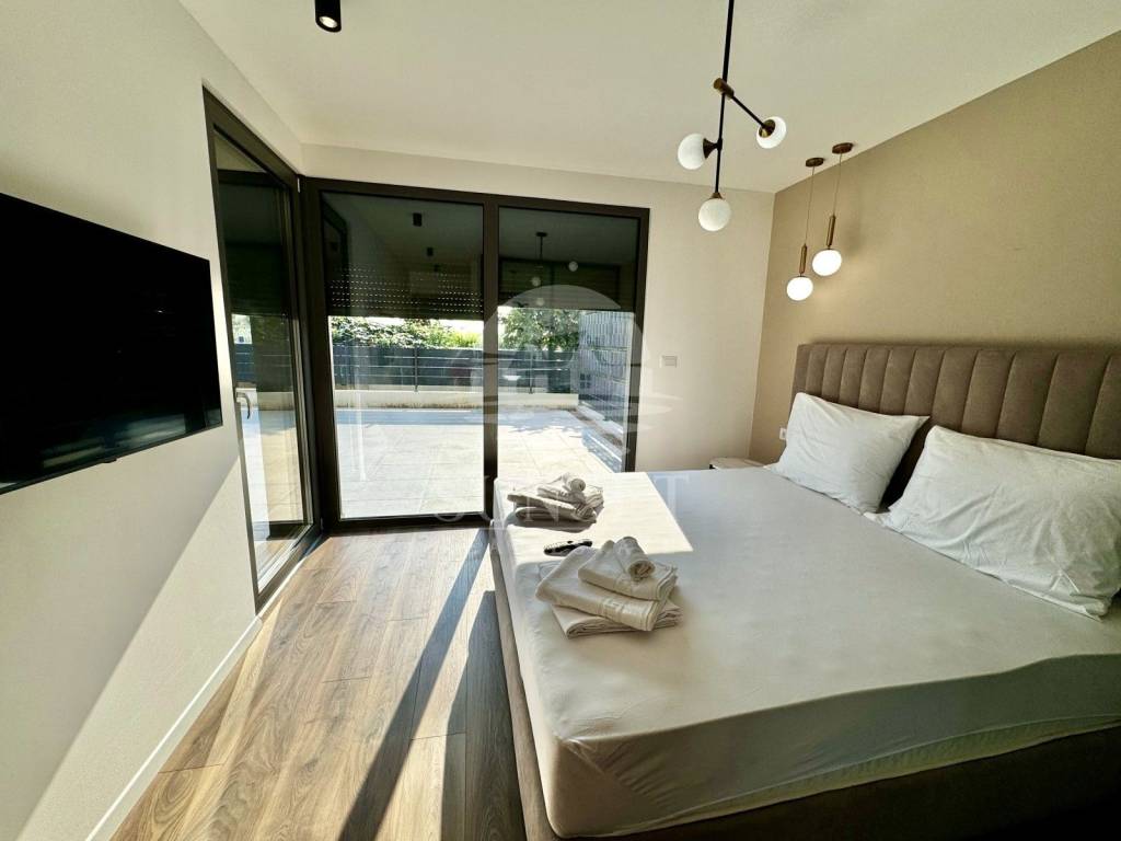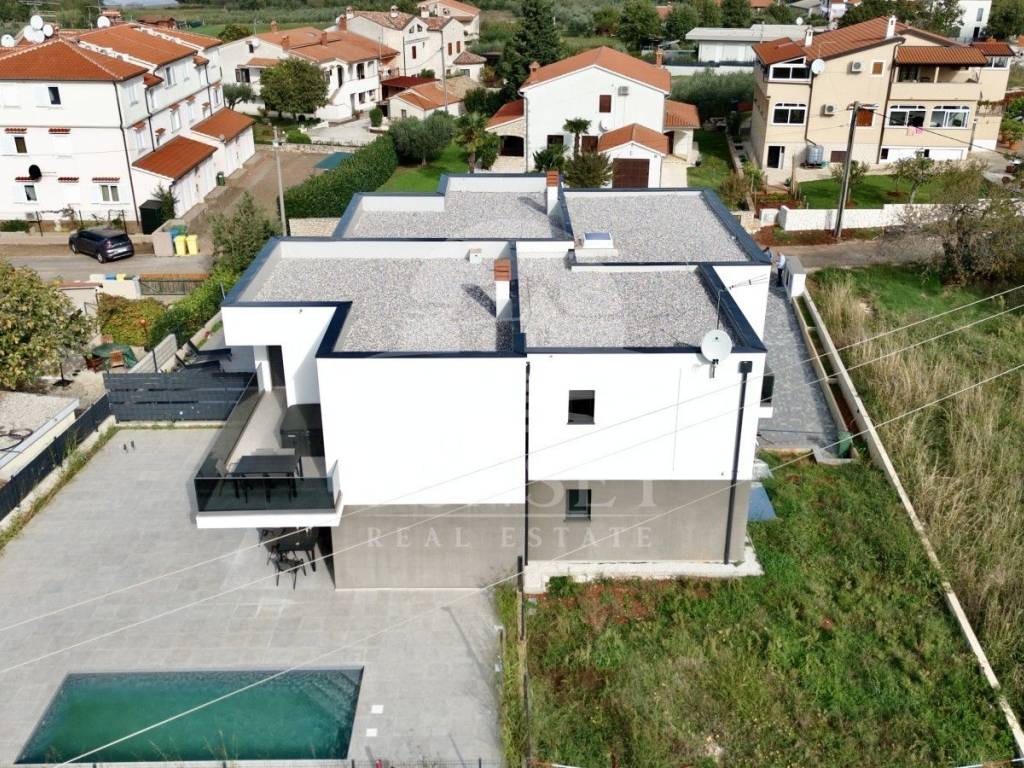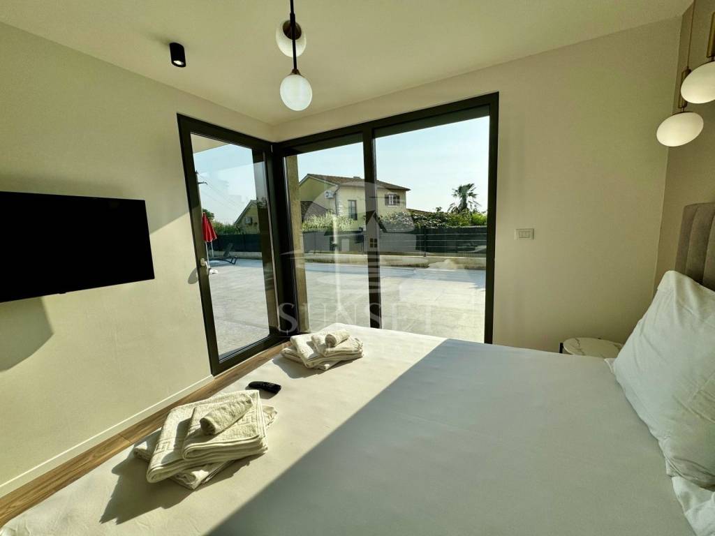 In der Nähe von Poreč befindet sich ein modernes, neu erbautes Gebäude mit luxuriösen Wohnungen und Meerblick. Diese Erdgeschosswohnung befindet sich in einem Gebäude mit nur vier Wohneinheiten und hat eine Gesamtfläche von 100,46 m. Sie besteht aus einem Eingangsbereich, drei geräumigen Schlafzimmern, zwei Bädern und einer zusätzlichen Gästetoilette. Das Wohnzimmer, der Essbereich und die Küche sind im offenen Konzept gestaltet, was den Raum noch großzügiger wirken lässt, und führen auf eine 15,63 m große Terrasse. Der gesamte Wohnbereich öffnet sich zu einer überdachten Terrasse mit einem privaten beheizten Pool, ausgestattet mit einer Trennwand für Privatsphäre.