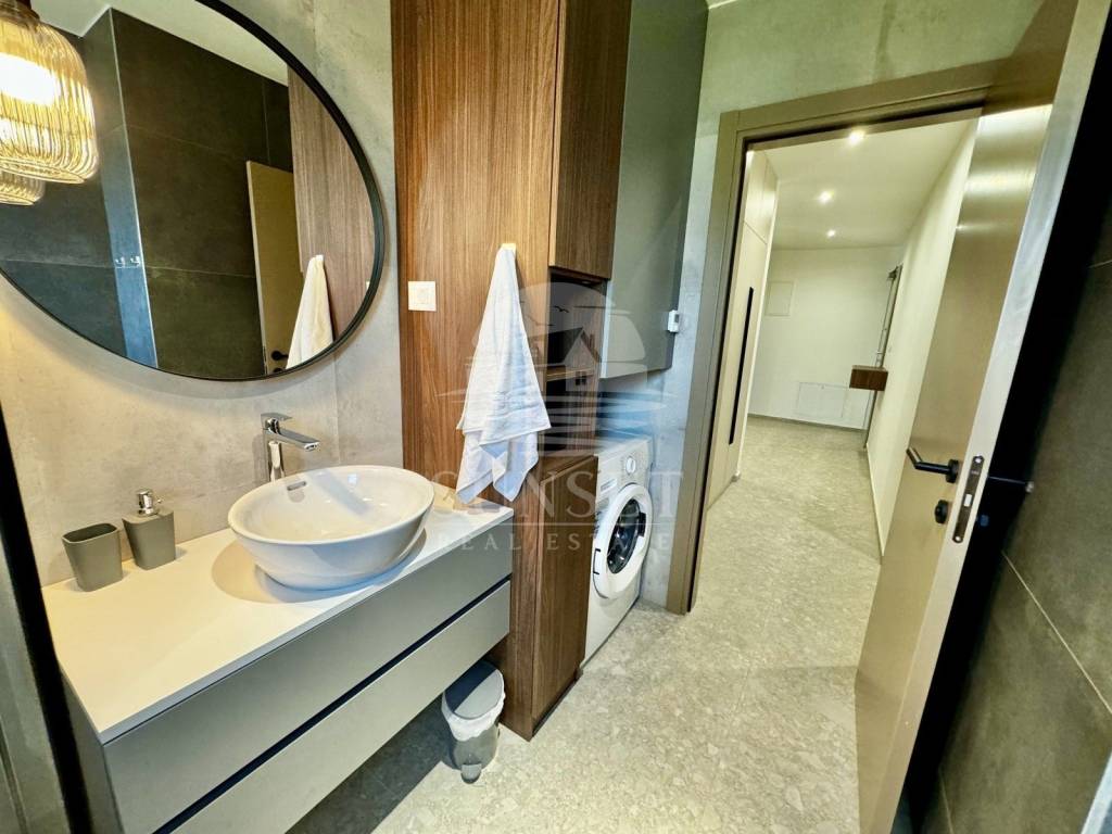 Die Wohnung ist aus hochwertigen Materialien gebaut. Die Böden sind je nach Verwendungszweck mit Stein, Keramik oder Holz ausgelegt. Die Außenfenster sind aus Aluminium mit dreifach verglastem Wärmeschutzglas, während die Innenfenster aus Holz sind. Heizung und Kühlung werden durch eine Multi-Split-Inverter-Klimaanlage bereitgestellt.