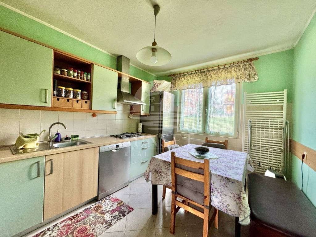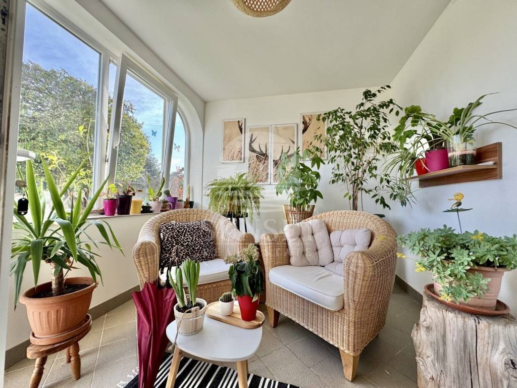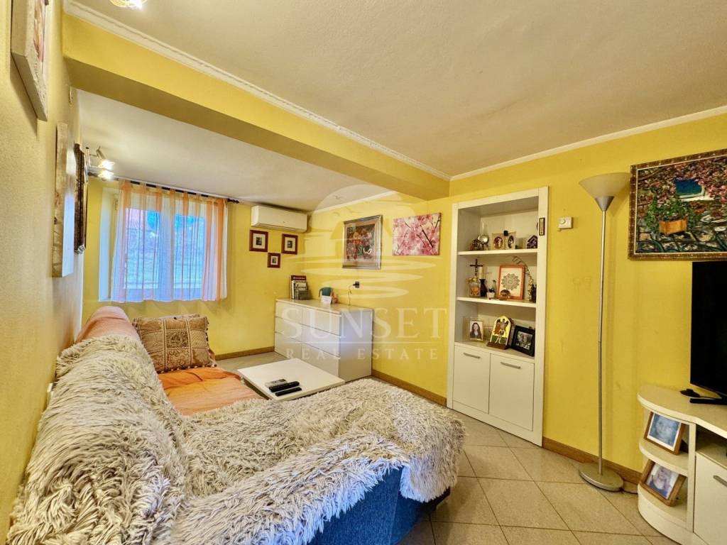 Die dritte Einheit liegt im Erdgeschoss und umfasst ein Wohnzimmer, eine Küche mit Essbereich, ein Schlafzimmer, ein Badezimmer und eine geschlossene Terrasse.
