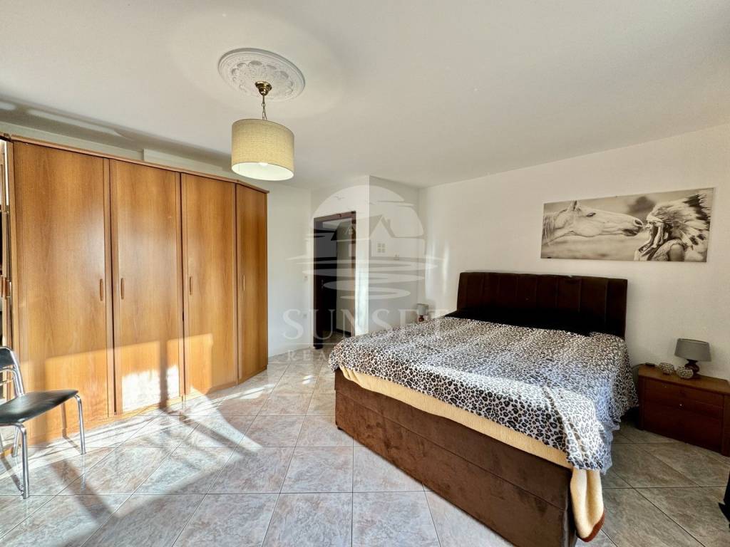 Die zweite Einheit, die sich im Obergeschoss befindet, besteht aus einem großzügigen, offenen Wohnbereich mit Küche, Essbereich und Wohnzimmer, zwei Schlafzimmern, einem Badezimmer sowie einem Flur mit Zugang zu einer großen Terrasse.
