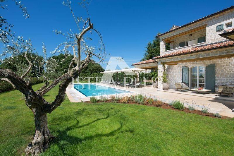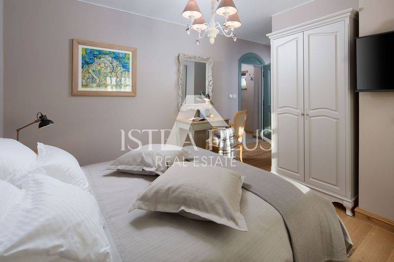 Im Obergeschoss befinden sich drei Doppelzimmer mit Badezimmern und Doppelbetten. Zwei Schlafzimmer haben Zugang zu Terrassen mit einem schönen Blick auf das Grün und das Meer und Rovinj in der Ferne.