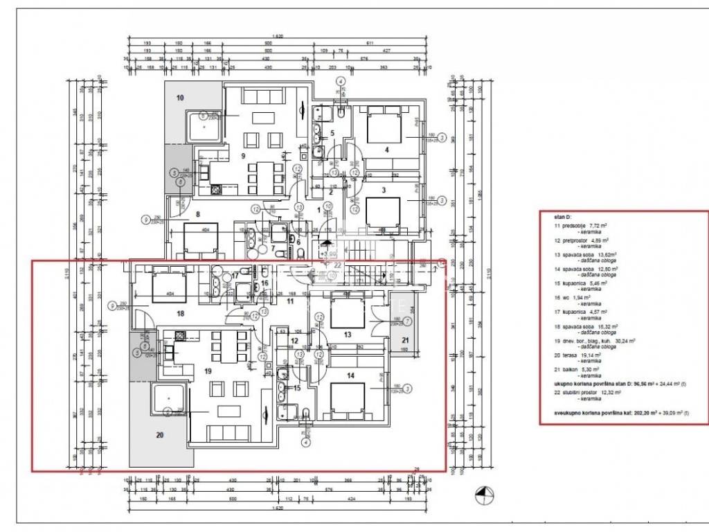 Die Wohnung befindet sich im ersten Stock mit einer Gesamtfläche von 96,56 m2 und besteht aus einer Eingangshalle, einem Hauptschlafzimmer mit eigenem Bad, 2 Schlafzimmern (eines mit eigenem Balkon), die sich ein Badezimmer teilen, einem Wohnzimmer mit ein Esszimmer und eine offene Küche. Vom Wohnzimmer und dem Hauptschlafzimmer gibt es eine Terrasse mit Whirlpool, die Größe der Terrasse beträgt 19,14 m2, die einen schönen Blick auf das Meer bietet.