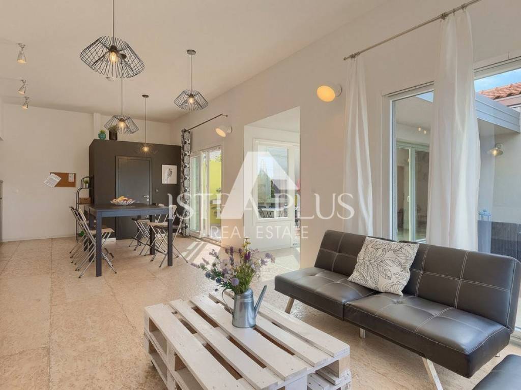 Vom Wohnzimmer aus gelangt man auf eine sonnige Terrasse mit Pool ideal für warme Sommertage.