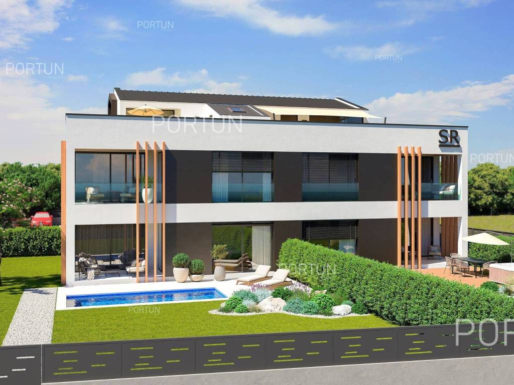 Eine moderne und funktionale Wohnung befindet sich im Erdgeschoss einer neuen Wohnvilla und verfügt über einen Parkplatz, eine Garage, einen Fahrradabstellraum, einen Pool und einen großen Garten. In diesem Gebäude sind lediglich sechs Luxuswohnungen geplant, von denen nur vier zum Verkauf stehen und zwei Wohnungen von Investoren gehalten werden. Die Lage ist äußerst attraktiv und gleichzeitig praktisch, da sich in der Nähe ein Kindergarten, ein Geschäft, ein Strand und ein Sporthafen befinden und das Stadtzentrum in zehn Minuten zu Fuß erreichbar ist. Kurze Entfernung zum Strand, eigener Garten, Südwestausrichtung, Garage und Parkplatz sind Eigenschaften, die sowohl von jüngeren als auch von älteren Käufern gewünscht werden. Daher sehen wir für diese Wohnung, obwohl der Bau noch nicht begonnen hat, großes Käuferinteresse. LageIstrien repräsentiert eine ideale Kombination aus kristallklarem Meer, Hügeln und Tälern, verspielten Flüssen und Wasserfällen, sonnenverwöhnten Weinbergen und zahlreichen historischen und kulturellen Sehenswürdigkeiten. Rovinj, bekannt als die Perle der Halbinsel Istrien, ist der Champion des kroatischen Tourismus, voller Leben im Sommer und Ruhe im Winter, gefärbt von den magischen Farben des Sonnenuntergangs und der charmanten Altstadt, die mit venezianischer Architektur bereichert ist. Die ruhige Lage in der Gegend von Rovinj, wo sich die Wohnung befindet, ist reich an interessanten Dingen und verschiedenen Inhalten:Meer | Strand 350 m Dienstleistungen | Geschäft 400 m - Café oder Bar 350 m - Grundschule 2 km - Krankenhaus 2,6 km - Apotheke 2,6 km Sport und Unterhaltung | Volleyballplatz 1000 m - Basketballplatz 1000 m - Der Waldpark Punta Corrente 4 km Städte in der Nähe | Poreč 34 km - Pula 35 km Verkehr | Autobahneinfahrt Kanfanar 15 km - Flughafen Pula 41 km Sehenswürdigkeiten | Das besondere ornithologische Reservat Palud 12 km AufteilungDer Eingang zur Villa befindet sich im Erdgeschoss, ebenso wie der Eingang zur Wohnung. Die modern gestaltete Wohnung mit hervorragender Raumaufteilung von 144 qm besteht aus einem Wohnzimmer mit Küche und einem Esszimmer 37,90 m2, zwei Schlafzimmern, einem Schlafzimmer mit einem Badezimmer, einem Badezimmer mit Dusche, einem Flur und einer Waschküche. Ausstattung Parkplatz für ein Auto Garage im Erdgeschoss 21,90 m2 Abstellraum im Erdgeschoss 10,30 m2 Garten 268,10 m2 Pool 21,10 m2Eigenschaften der VillaDie Wohnung befindet sich in einer Stadtvilla, die sich Erdgeschoss, ein Obergeschoss und Dachgeschoss erstreckt. Der Eingang zur Villa erfolgt auf der Ebene des Erdgeschosses, von der Nordwestseite, und die vertikale Kommunikation erfolgt über eine interne Treppe und einen Aufzug. Die grundlegenden architektonischen Merkmale dieser zeitgenössischen Stadtvilla sind: 6 Wohnungen - 10 Parkplätze - 5 Garagen Außenwände | Isolierung 10 cm + Wände aus Blockziegel Decken aus Stahlbeton Baubeginn 2024 | Geplante Baufertigstellung 2026/6AusrüstungSchreinerei/Fenster | Tischlerei aus Aluminium mit Doppelverglasung - Rollos - Ferngesteuerte Sonnenschutzrollos - Einbruchhemmende Eingangstür - Designer-InnentürenHeizung und Kühlung | Fußbodenheizung mit Wärmepumpe - Klimaanlage - Kombinierter WarmwasserspeicherBodenbelag | Hochwertige Keramikfliesen - ParkettAußenbereichAusrüstung | AußenbeleuchtungGrünflächen | Rasen mit automatischer BewässerungInfrastruktur Anschluss an das Stromnetz mit eigenem Zähler Eigener Anschluss an das Wasserversorgungsnetz | Entkalkungssystem Anschluss an die Kanalisation Makadamstraße (Öffentlich)DokumentationErhaltene Dokumentation | Baugenehmigung - HauptprojektFlächenberechnungIn der Oberfläche der Wohnung (144,44 m2) umfasst die Bereiche dieser Räume:Wohnraum = 91,30 m2*Garage = 16,42 m2**Abstellraum = 7,73 m2**Parkplatz = 2,18 m2***Garten = 26,81 m2*****Flächen werden mit Koeffizienten berechnet k= 1,00**Flächen werden mit Koeffizienten berechnet k= 0,75***Flächen werden mit Koeffizienten berechnet k= 0,15****Flächen werden mit Koeffizienten berechnet k= 0,10Datenquelle = Hauptprojekt
