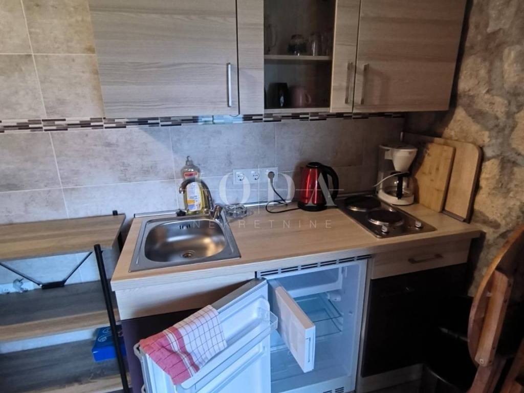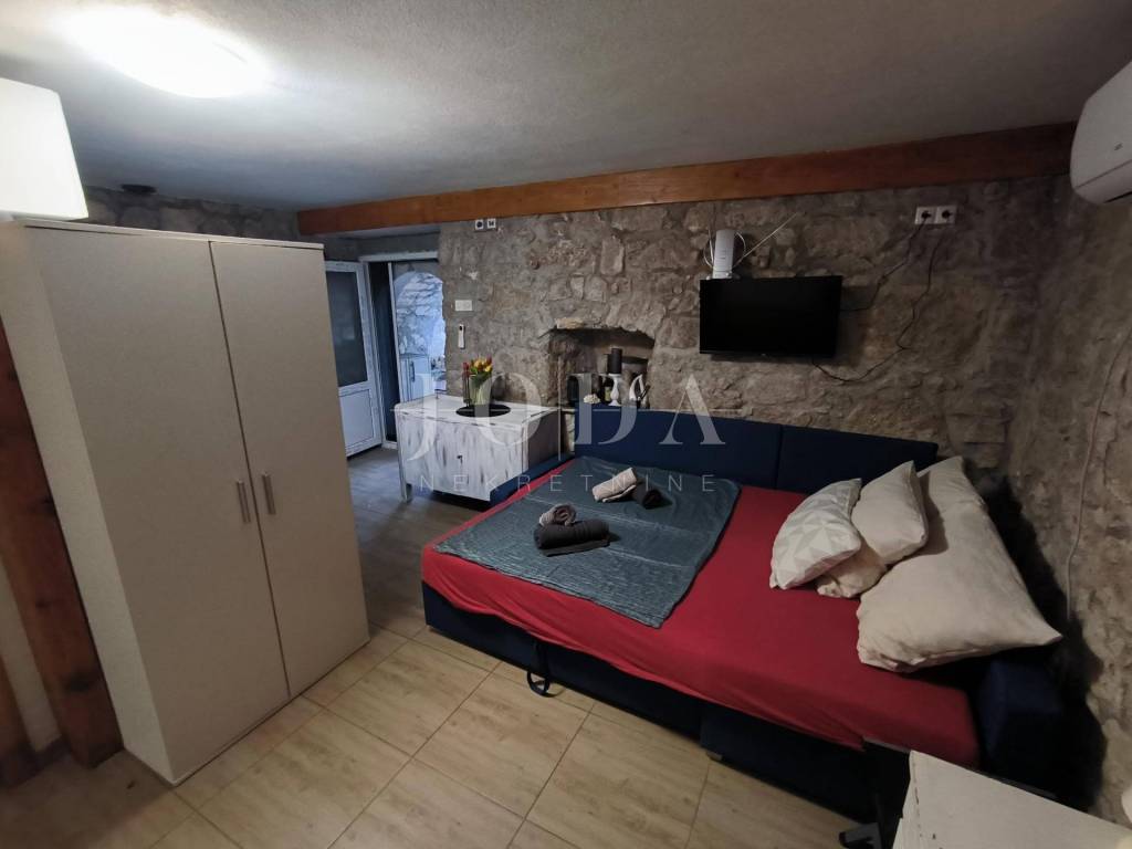Wir verkaufen ein renoviertes Haus mit zwei Wohnungen, bestehend aus Erdgeschoss und Obergeschoss, das in zwei Studio-Apartments mit jeweils 26 m Wohnfläche unterteilt ist. Vor der Erdgeschosswohnung befindet sich ein angelegter Garten mit Grillplatz, und vom Obergeschoss aus genießt man einen wunderschönen Blick auf die Berge und das Meer.