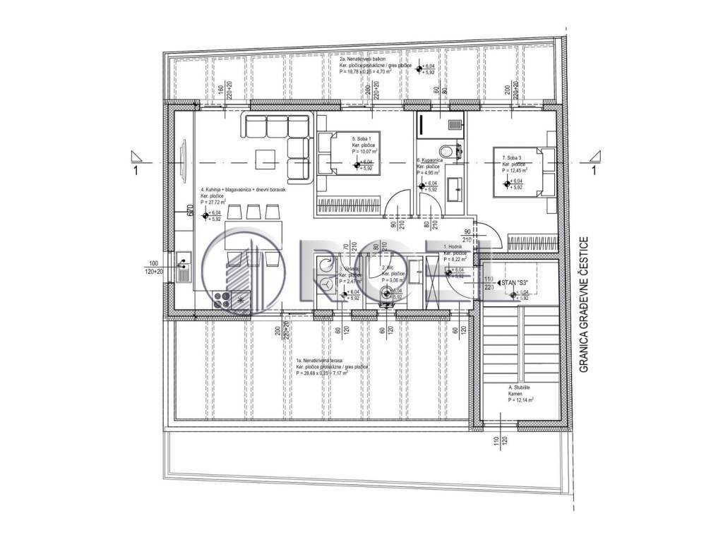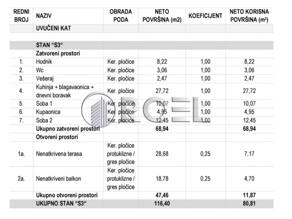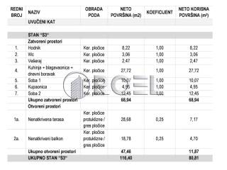Three-room apartment S3 with a total NKP of 80.81 m2, located in the Trokut settlement (Novi Zagreb). It is located on the second floor of a residential building with a total of 2 floors. It is the only apartment on that floor. It consists of a hallway, two bedrooms, bathroom, toilet, laundry room, kitchen with dining room and living room, as well as an uncovered terrace and an uncovered balcony. The apartment also has one outdoor parking space.