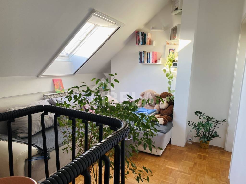 Na gornjoj etaži smještena je velika spavaća soba s hodnikom, a prostor je moguće vrlo jednostavno pregraditi u dvije ili čak tri sobe, kako je i prije bilo, što pruža odličnu mogućnost prilagodbe većoj obitelji ili onima koji trebaju dodatne prostorije (npr. radnu sobu ili dječje sobe).