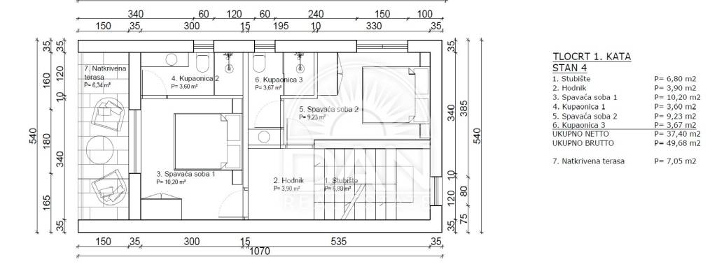 Über die Innentreppe gelangt man in den ersten Stock, wo sich zwei Schlafzimmer befinden, jeweils mit eigenem Badezimmer und Zugang zu einer überdachten Terrasse von 6,34 m². Das zweite Stockwerk besteht aus dem Hauptschlafzimmer mit eigenem Bad und einer teilweise überdachten Terrasse mit schönem Meerblick.