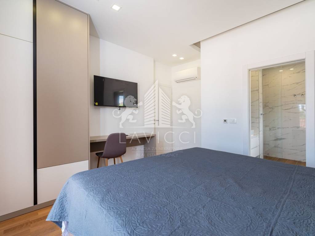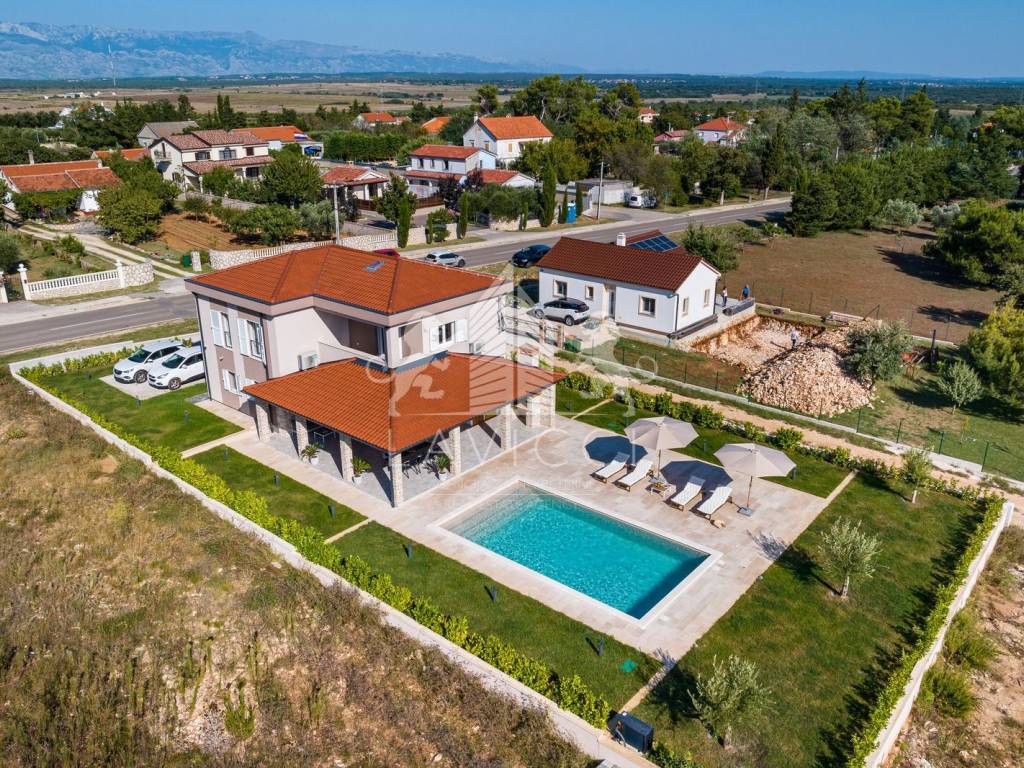 Wir präsentieren Ihnen eine außergewöhnliche, moderne Villa, die zeitgenössische Architektur, mediterranes Flair, hochwertige Materialien und absolute Privatsphäre vereint. Sie befindet sich in der ruhigen und gepflegten Umgebung von Ninski Stanovi, nur wenige Minuten vom Meer und der historischen Stadt Nin entfernt.