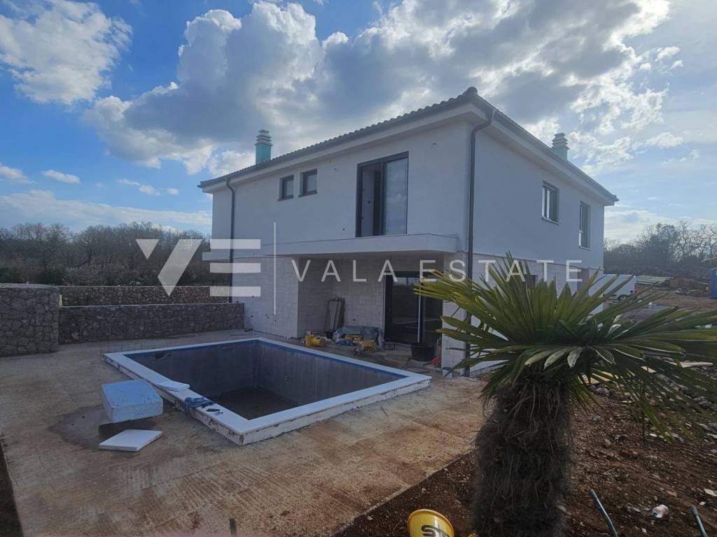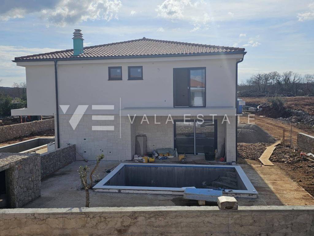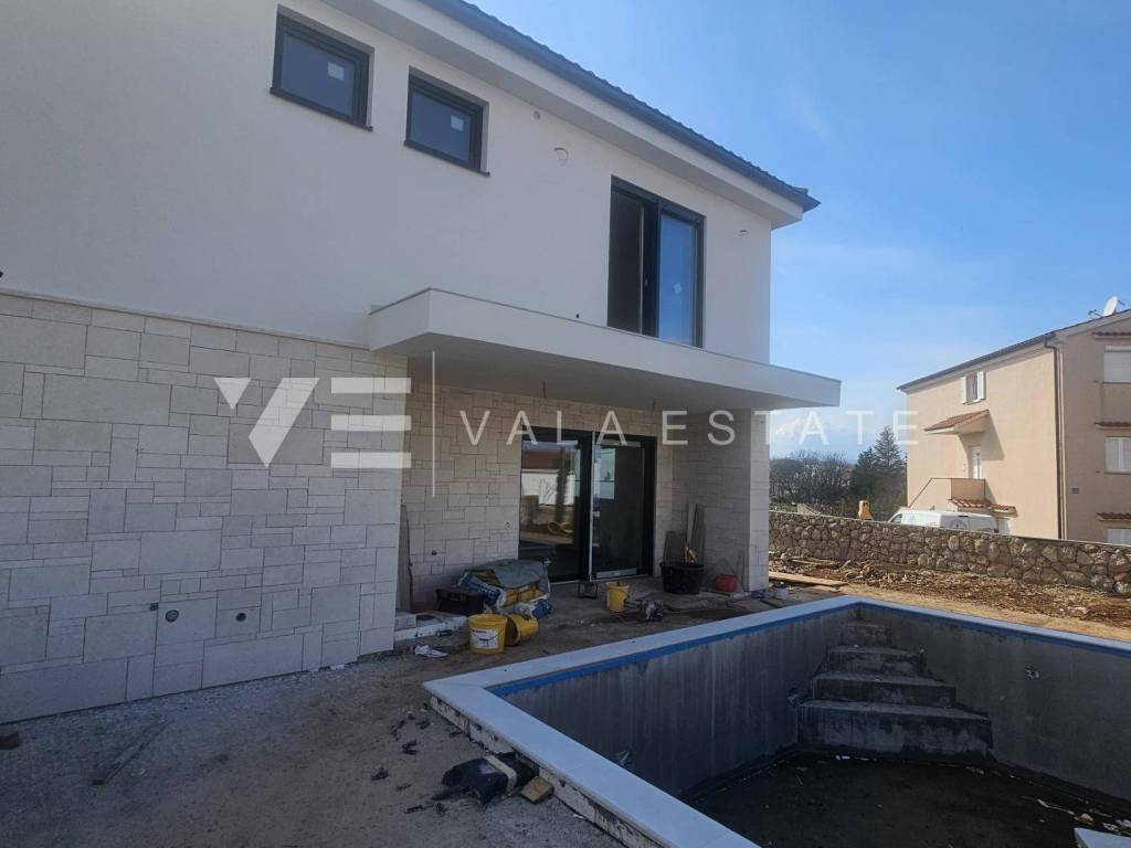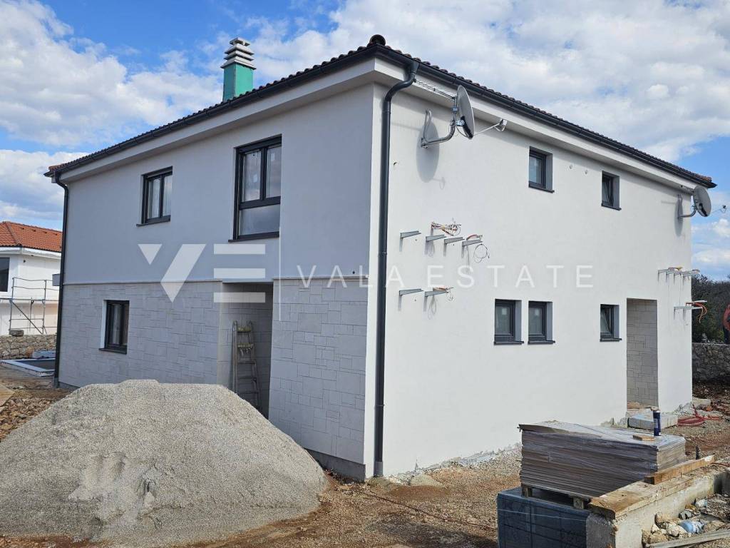Immobilienangebot auf der Insel Krk, Region Malinska Zum Verkauf steht ein modernes, neues Doppelhaus in außergewöhnlicher Lage in der Nähe von Malinska, nur 200 m vom Meer und Strand entfernt. Das Haus bietet 140 m Wohnfläche, verteilt auf Erdgeschoss und Obergeschoss. Im Erdgeschoss befinden sich ein Abstellraum, ein Badezimmer, eine Wohnküche und ein geräumiges Wohnzimmer mit Zugang zu einer überdachten Terrasse. Das über eine Innentreppe erreichbare Obergeschoss verfügt über zwei Badezimmer und drei Schlafzimmer, eines davon mit eigenem Bad und Zugang zu einem Balkon mit herrlichem Meerblick. Im Garten befinden sich ein Swimmingpool mit Liegewiese und eine Sommerküche. Für den Bau wurden hochwertige Materialien und Ausstattungsmerkmale verwendet, darunter hochwertige Bodenbeläge und Sanitäranlagen, eine Klimaanlage in allen Räumen, Fußbodenheizung, hochwertige PVC-Einbaufenster und -türen sowie Sicherheitstüren. Zwei Parkplätze befinden sich direkt am Hofeingang. Dieses wunderschöne und hochwertige Neubauobjekt befindet sich in einer sehr attraktiven und begehrten Lage, nur 200 m von traumhaften Stränden und unweit des Ortskerns mit allen Annehmlichkeiten entfernt. Die Immobilie befindet sich derzeit im Bau und wird voraussichtlich im Frühjahr 2026 fertiggestellt.