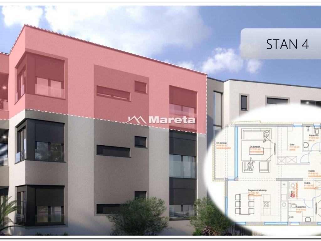 Na prodaju je komforan trosoban stan S4 na drugom katu zgrade s 2 garažna parkirna mjesta u podrumu zgrade a sastoji se od:
