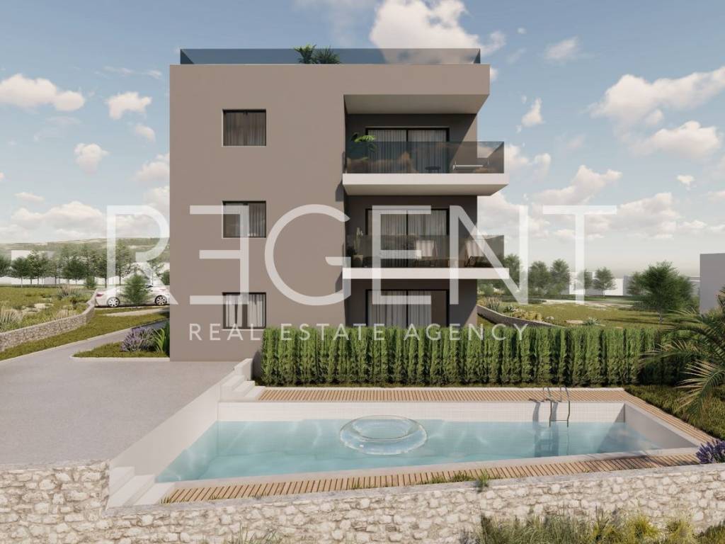 Wir vermitteln den Verkauf einer Penthouse-Wohnung mit privater Dachterrasse in einem modernen Neubau in Okrug Gornji auf Čiovo.Das Gebäude besteht aus einem Erdgeschoss und zwei Etagen mit insgesamt neun Wohneinheiten.Die Wohnung befindet sich im zweiten Stock und besteht aus:Flur (6,30 m²) erstes Schlafzimmer (11,68 m²) zweites Schlafzimmer (8,69 m²) WC (1,71 m²) Badezimmer (3,90 m²) Küche, Esszimmer und Wohnzimmer (19,01 m²) Loggia (8,00 m²) Gesamtfläche der Wohnung: 57,29 m².Zusätzlich gehört zu dieser Wohnung eine 55,76 m² große Dachterrasse, die die Möglichkeit bietet, einen Whirlpool, eine Sommerküche oder einen Entspannungsbereich zu installieren.Das Gebäude zeichnet sich durch hohe Baustandards und die Installation hochwertiger Ausstattung aus, darunter:PVC-Türen und -Fenster mit Dreifachverglasung und Glasgeländern Eingangstüren mit Einbruch- und Brandschutz Fußbodenheizung in Bädern und Fluren eingebaute Klimaanlage im Wohnzimmer und Vorbereitung für eine Klimaanlage in allen Zimmern erstklassiges Laminat und Porzellankeramik Käufer können Materialien für die Inneneinrichtung nach ihren eigenen Wünschen auswählen.Im Rahmen des Neubaus befindet sich ein Gemeinschaftspool mit den Maßen 13 m x 6,30 m, der allen Bewohnern zur Verfügung steht. Die Wohnung verfügt über einen Außenstellplatz im Preis inbegriffen, ein zusätzlicher Stellplatz kann für 12.000 Euro erworben werden.Die geplante Fertigstellung des Baus ist Dezember 2025.Die Wohnung befindet sich in attraktiver Lage, in der Nähe des Meeres, der Strände und aller wichtigen Einrichtungen. Čiovo ist verkehrstechnisch gut mit dem Festland verbunden, in unmittelbarer Nähe der UNESCO-Stadt Trogir, was es perfekt zum Wohnen oder als Investition in die touristische Vermietung macht.Für weitere Informationen oder zur Vereinbarung eines Besichtigungstermins kontaktieren Sie uns bitte.