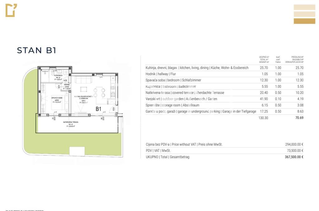 Nur 7 Autominuten von Zadar und 10 Minuten vom Flughafen entfernt liegt Sukošan, einer der gefragtesten Orte zum Leben und Investieren an der kroatischen Küste. Ausgezeichnete Verkehrsanbindung, eine gut ausgebaute Infrastruktur und die Nähe zum Meer machen es zur idealen Wahl für alle, die eine Kombination aus entspannter mediterraner Umgebung und modernem Komfort suchen. In einem ruhigen Teil von Sukošan, umgeben von jahrhundertealten Olivenhainen und Grünflächen, befindet sich das Projekt Olive Tree – ein Komplex aus drei eleganten Gebäuden, die sich perfekt in die natürliche Landschaft einfügen. Jede Wohnung bietet ein hohes Maß an Privatsphäre, viel Licht und einen Blick, der bis zum Archipel von Zadar reicht. Luxuriöse Zweizimmerwohnung B1 im Erdgeschoss des Olive Tree B Gebäudes. Die Wohnung besteht aus: Küche mit Essbereich und Wohnzimmer (25,70 m2), Flur (1,05 m2), Schlafzimmer 1 (12,30 m2), Badezimmer (5,55 m2), überdachte Terrasse (10,20 m2), Außengarten (4,19 m2), Abstellraum (3,08 m2), Garagenstellplatz (8,63 m2). Gesamte Nutzfläche von 70,69 m2. Olive Tree A Gebäude - ein Raum der Stille, des Lichts und der unaufdringlichen Eleganz. Olive Tree A ist ein Wohngebäude, das für diejenigen geschaffen wurde, die Raum, Ruhe und Luftigkeit zu schätzen wissen. Es besteht aus drei exklusiven Wohnungen, die alle sorgfältig entworfen wurden, um maximalen Komfort, Privatsphäre und ästhetisches Erlebnis zu bieten. Große Terrassen mit Meerblick, viel Tageslicht und eine harmonische Beziehung zwischen Innen- und Außenbereich machen Olive Tree A zur perfekten Wahl für das Familienleben oder einen luxuriösen Rückzugsort aus der Hektik der Stadt. Das Projekt wird nach höchsten Standards gebaut – POROTHERM-Blöcke, STO-Fassade, REHAU-Tischlerei und Naturstein Römisches Travertin in Treppenhäusern und Balkonen. Im Innenbereich dominieren Mehrschichtparkett aus Eiche, Fußbodenheizung (DEVI), Bosch-Geräte in Küchen und Badezimmern sowie Mitsubishi-Klimaanlagen. Glasgeländer und dezente Ambientebeleuchtung unterstreichen zusätzlich die Eleganz des Raumes. Olive Tree ist mehr als nur eine Immobilie – es ist ein Lebensstil, der Schönheit, Funktionalität und langfristigen Wert vereint. Die Fertigstellung der A- und B-Gebäude wird für Ende Juli 2025 und der C-Gebäude für Anfang Juni 2026 erwartet. Der Preis der Wohnung inklusive Mehrwertsteuer beträgt 367.500 EUR. Für weitere Informationen und Besichtigungen – kontaktieren Sie uns vertrauensvoll.