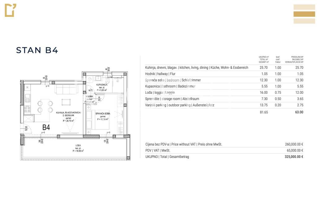Nur 7 Autominuten von Zadar und 10 Minuten vom Flughafen entfernt liegt Sukošan, einer der begehrtesten Orte zum Leben und Investieren an der kroatischen Küste. Die ausgezeichnete Verkehrsanbindung, die gut ausgebaute Infrastruktur und die Nähe zum Meer machen es zur idealen Wahl für alle, die eine Kombination aus entspannter mediterraner Umgebung und modernem Komfort suchen. In einem ruhigen Teil von Sukošan, umgeben von jahrhundertealten Olivenhainen und Grünflächen, befindet sich das Projekt Olive Tree – ein Komplex aus drei eleganten Gebäuden, die sich perfekt in die natürliche Landschaft einfügen. Jede Wohnung bietet ein hohes Maß an Privatsphäre, viel Licht und einen Blick, der bis zum Archipel von Zadar reicht. Luxuriöse Zwei-Zimmer-Wohnung B3 im 2. Stock des Olive Tree B Gebäudes. Die Wohnung besteht aus: Küche mit Essbereich und Wohnzimmer (25,70 m2) Flur (1,05 m2) Schlafzimmer 1 (12,30 m2) Badezimmer (5,55 m2) überdachte Terrasse (12,00 m2) Abstellraum (3,08 m2) Außenstellplatz (13,75) Gesamtnettonutzfläche 62,43 m2. Olive Tree B Gebäude - ein Ort der Stille, des Lichts und der unaufdringlichen Eleganz. Olive Tree B ist ein Wohngebäude, das für diejenigen geschaffen wurde, die Wert auf Raum, Stille und Luftigkeit legen. Es besteht aus drei exklusiven Wohnungen, die jeweils sorgfältig entworfen wurden, um maximalen Komfort, Privatsphäre und ästhetisches Erlebnis zu bieten. Große Terrassen mit Meerblick, viel Tageslicht und ein harmonisches Verhältnis von Innenraum und Umgebung machen Olive Tree B zur perfekten Wahl für das Familienleben oder einen luxuriösen Rückzugsort aus der Hektik der Stadt. Das Projekt wurde nach höchsten Standards gebaut – POROTHERM-Blöcke, STO-Fassade, REHAU-Tischlerei und Naturstein Römischer Travertin in Treppenhäusern und Balkonen. Im Innenraum dominieren mehrschichtiges Eichenparkett, Fußbodenheizung (DEVI), Bosch-Geräte in Küchen und Badezimmern sowie Mitsubishi-Klimaanlagen. Glasgeländer und dezente Ambientebeleuchtung unterstreichen zusätzlich die Eleganz des Raumes. Olive Tree ist mehr als nur eine Immobilie – es ist ein Lebensstil, der Schönheit, Funktionalität und langfristigen Wert vereint. Die Fertigstellung der Gebäude A und B wird für Ende Juli 2025 und des Gebäudes C für Anfang Juni 2026 erwartet. Der Preis der Wohnung inklusive Mehrwertsteuer beträgt 325.000 EUR Für weitere Informationen und Besichtigungen – kontaktieren Sie uns vertrauensvoll.