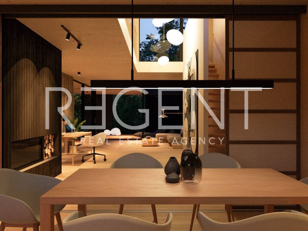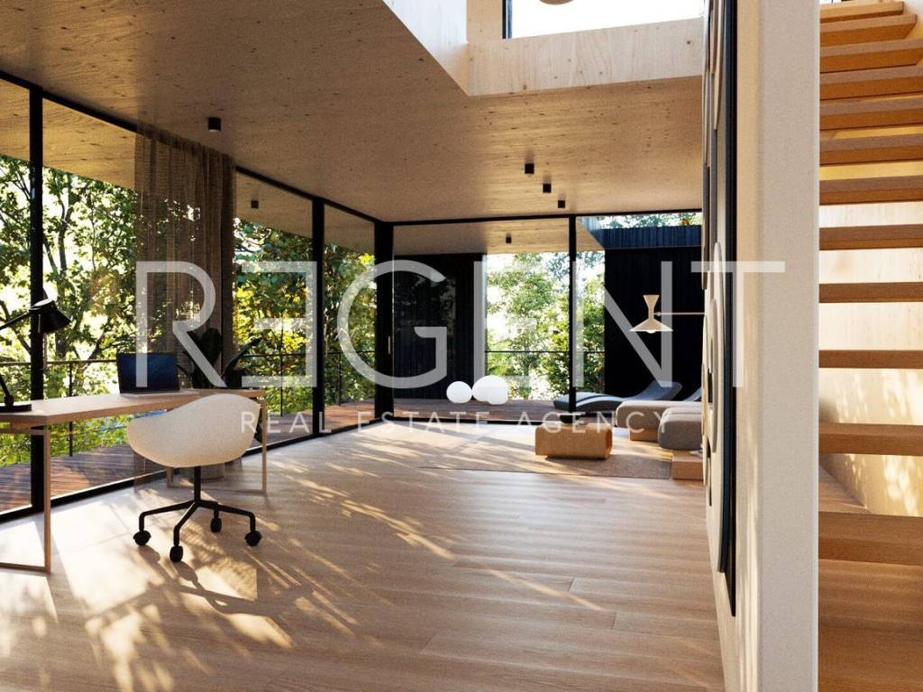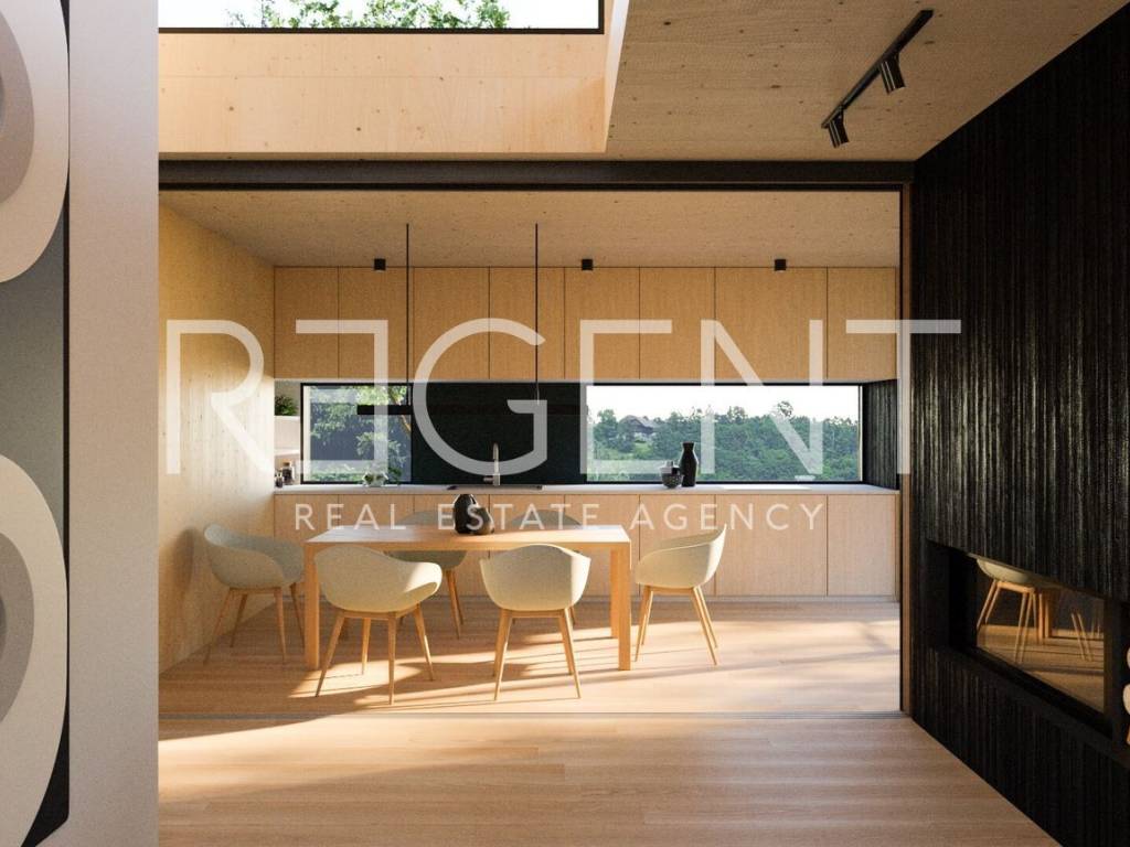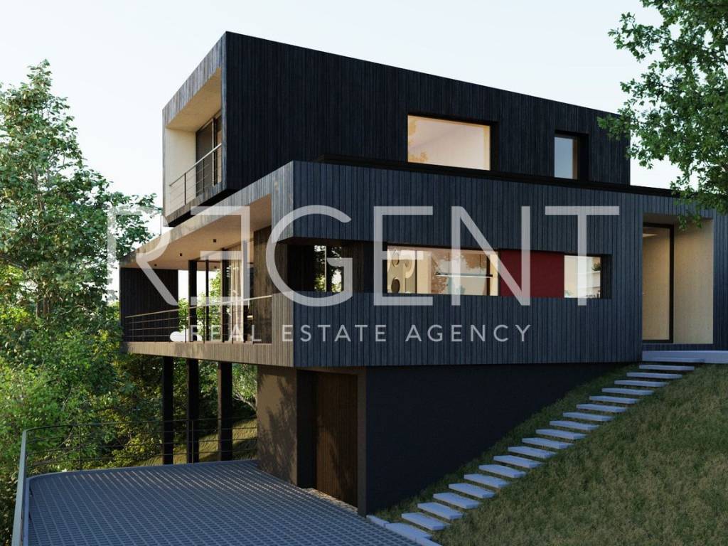 Zum Verkauf steht ein Haus an den Hängen des nördlichen Teils von Zagreb in einer ruhigen Sackgasse mit mehreren Häusern auf dem Šestinski-Gipfel. Das Baugrundstück hat eine fast regelmäßige rechteckige Form mit einer Neigung des Geländes in Richtung Nord-Süd und Ost-West, von der aus man einen Blick auf die ganze Stadt hat. Das Konzept betont modernes urbanes Wohnen nach den Prinzipien des ökologischen Holzbaus und die Verbindung moderner Architektur nach den Prinzipien der Feng-Shui-Schule. Das Haus hat einen rechteckigen Grundriss, geometrisch klare Linien und eine Form, die von einem Aufenthalt in einem traditionellen Haus für Zeremonien im peruanischen Amazonasgebiet inspiriert ist. Die Idee war, dass diese Form auf Säulen direkt aus dem natürlichen Gelände und der Umgebung entsteht und dabei den Standort, die natürliche Neigung des Geländes und so wenig Eingriffe wie möglich in den bestehenden Boden und die Natur berücksichtigt. Die Ausrichtung nach allen Himmelsrichtungen ermöglichte eine ideale Positionierung des Hauses mit Schutz auf der Nordseite und Offenheit durch Glaswände und überdachte Terrassen nach Süden und Westen, bzw. zum Wald und Garten. Im Sommer ist es durch die Baumkronen von Laubbäumen geschützt, die ihm Schatten spenden, und im Winter öffnet sich der Blick auf die ganze Stadt und es ist Sonneneinstrahlung möglich. Die Überdachung der Terrassen resultierte aus der Berechnung der Sonneneinstrahlung, um die maximale Nutzung der Sonnenwärme im Laufe der Jahreszeiten zu erzielen. Die Konstruktion der Säulen und der ersten Deckenplatte ist aus Stahlbeton, während die gesamte übrige Konstruktion des Hauses aus CLT (Kreuzlagenholz) besteht, das neben seinen hervorragenden tragenden Eigenschaften auch günstige ökologische, ästhetische und energetische Eigenschaften besitzt, weshalb es im Innen- und Außenbereich größtenteils sichtbar belassen wurde. Die Fassadenverkleidung ist ebenfalls aus Holz, das mit der Shou Sugi Ban-Technik bearbeitet wurde, die im Japan des 18. Jahrhunderts entstand und zur Behandlung von Holz verwendet wird, um es widerstandsfähig gegen alle Wetterbedingungen zu machen und nicht gewartet werden muss. Das Ergebnis dieser Technik sind klare, deutliche Linien und die unermessliche Schönheit der Textur des Holzes, die unveränderlich ist. Das Haus ist mit drei oberirdischen Geschossen geplant, wobei die Umwelt maximal berücksichtigt wird. Das erste oberirdische Geschoss ist ein Souterrain, in dem sich die Garage und die technischen Räume befinden. Im Erdgeschoss als Hauptgeschoss befinden sich der Eingangsbereich im Osten, die Küche im Südosten, das Esszimmer, der Arbeitsbereich und das Wohnzimmer im Südwesten, ideal positioniert nach den Feng-Shui-Prinzipien. Im ruhigeren Teil des Erdgeschosses befindet sich ein Schlafzimmer mit Bad und Ausgang zur Terrasse. Das zurückgezogene Obergeschoss ist durch eine Galerie und eine Innentreppe mit dem Erdgeschoss verbunden, und auf der Galerie befindet sich ein Raum für Yoga, Meditation und Entspannung mit Blick auf den Wald und die Stadt. Im ruhigeren Teil des Obergeschosses befindet sich ein Schlafzimmer mit Bad. Es sind zwei Park- und Garagenplätze vorgesehen, einer in der Garage im Untergeschoss und der andere auf dem Baugrundstück an der dafür vorgesehenen Stelle neben der Zufahrt zur Garage.