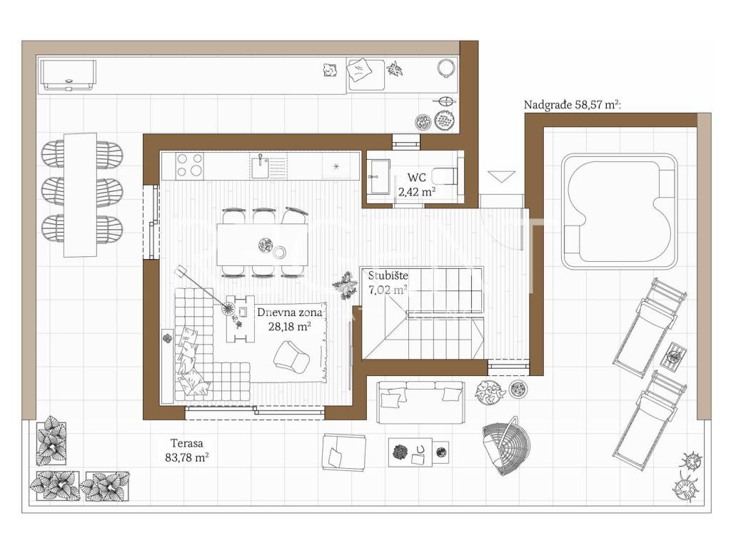 Die Wohnung befindet sich im 2. Stock und Dachgeschoss eines Wohnhauses in Kaštel Lukšić. Aufgrund der Aufteilung und der großen Terrasse eignet sich diese Wohnung für Familien, aber auch als Investition für Tourismus oder Langzeitmiete. Die gesamte Nettofläche der Wohnung beträgt 101,87 m². Das Untergeschoss umfasst einen Flur, ein Badezimmer, drei Schlafzimmer und ein Treppenhaus. Das Obergeschoss umfasst einen Wohnbereich mit Küche und Esszimmer, eine zusätzliche Toilette und Zugang zu einer geräumigen Dachterrasse von 83,78 m². Die Wohnung ist mit Fußbodenheizung, Klimaanlage und PVC-Fenstern ausgestattet. Die Bodenbeläge sind eine Kombination aus Keramik und Parkett. Die Terrasse bietet ausreichend Platz zum Entspannen, Essen und für zusätzliche Outdoor-Aktivitäten. Das Gebäude befindet sich in einem ruhigen Teil von Kaštela, unterhalb der Hauptstraße, zwischen Kaštel Lukšić und Kaštel Kambelovac. In der Nähe befinden sich Geschäfte, ein Kindergarten, eine Schule, eine Ballettschule, ein Weingut und öffentliche Verkehrsmittel. Die Entfernung zum Meer beträgt nur wenige Autominuten. Der Baubeginn ist für September 2025 geplant, die Fertigstellung bis Ende 2026. Der Einzug ist nach Erteilung der Nutzungserlaubnis möglich. Die Zahlung kann phasenweise, je nach Baufortschritt, vereinbart werden, mit der Möglichkeit des Kaufs per Kredit mit einer Eigenbeteiligung von mindestens 40%. Für weitere Informationen oder zur Vereinbarung eines Besichtigungstermins können Sie sich gerne an uns wenden.