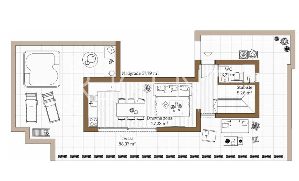 Diese zweistöckige Wohnung befindet sich im zweiten Stock und im Dachgeschoss eines neuen Gebäudes in Kaštel Lukšić. Die Terrasse mit Meerblick und der separate Wohn- und Schlafbereich machen sie ideal für Familien, aber auch als Investition in Vermietung oder Tourismus. Die Wohnung mit einer Gesamtfläche von 103,62 m² ist auf zwei Etagen verteilt. Im unteren Stockwerk befinden sich drei Schlafzimmer, ein Badezimmer, ein Flur und eine kleinere Terrasse. Eine Innentreppe führt in das obere Stockwerk, wo sich ein geräumiger Wohnbereich mit Küche, Esszimmer und Wohnzimmer, eine zusätzliche Toilette und eine große Terrasse von 88,37 m² befinden. Die Wohnung ist mit Klimaanlage und PVC-Fenstern ausgestattet, die Böden sind eine Kombination aus Parkett und Keramik. Die geräumige Terrasse bietet Meerblick und ausreichend Platz für den Aufenthalt im Freien. Das Gebäude befindet sich in einer ruhigen Wohngegend zwischen Kaštel Lukšić und Kaštel Kambelovac, unterhalb der Hauptstraße. In der Nähe befinden sich eine Schule, ein Kindergarten, Geschäfte, öffentliche Verkehrsmittel, eine Ballettschule und andere Einrichtungen. Das Meer und die Promenade sind in wenigen Autominuten erreichbar. Der Baubeginn ist für September 2025 geplant. Die Zahlung erfolgt in Bauabschnitten. Es besteht die Möglichkeit, über ein Darlehen mit einer Mindestbeteiligung von 40 % zu kaufen. Für weitere Informationen oder zur Vereinbarung eines Besichtigungstermins können Sie uns gerne kontaktieren.