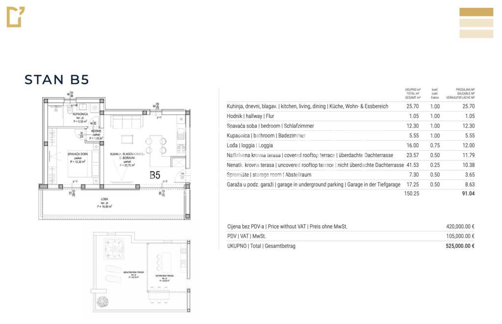 Nur 7 Autominuten von Zadar und 10 Minuten vom Flughafen entfernt liegt Sukošan, einer der begehrtesten Orte zum Leben und Investieren an der kroatischen Küste. Hervorragende Verkehrsanbindung, eine gut ausgebaute Infrastruktur und die Nähe zum Meer machen es zur idealen Wahl für alle, die eine Kombination aus entspannter mediterraner Umgebung und modernem Komfort suchen. In einem ruhigen Teil von Sukošan, umgeben von jahrhundertealten Olivenhainen und Grünflächen, befindet sich das Olive Tree-Projekt - ein Komplex aus drei eleganten Gebäuden, die sich perfekt in die natürliche Landschaft einfügen. Jede Wohnung bietet ein hohes Maß an Privatsphäre, viel Licht und einen Blick, der bis zum Archipel von Zadar reicht. Luxuriöse Zwei-Zimmer-Wohnung B5 im 4. Stock des Olive Tree B-Gebäudes. Die Wohnung besteht aus: Küche mit Essbereich und Wohnzimmer (25,70 m2) Flur (1,05 m2) Schlafzimmer 1 (12,30 m2) Badezimmer (5,55 m2) überdachte Terrasse (12,00 m2) überdachte Dachterrasse (11,79 m2) unüberdachte Dachterrasse (10,38 m2) Abstellraum (3,65 m2) Garagenstellplatz (17,25 m2) Gesamtnettonutzfläche 91,04 m2. Olive Tree B Gebäude - ein Ort der Stille, des Lichts und der unaufdringlichen Eleganz. Olive Tree B ist ein Wohngebäude, das für diejenigen geschaffen wurde, die Wert auf Raum, Ruhe und Luftigkeit legen. Es besteht aus drei exklusiven Wohnungen, die jeweils sorgfältig entworfen wurden, um maximalen Komfort, Privatsphäre und ästhetisches Erlebnis zu bieten. Große Terrassen mit Meerblick, viel Tageslicht und eine harmonische Beziehung zwischen Innenraum und Umgebung machen Olive Tree B zur perfekten Wahl für das Familienleben oder einen luxuriösen Rückzugsort aus der Hektik der Stadt. Das Projekt wurde nach den höchsten Standards gebaut - POROTHERM-Blöcke, STO-Fassade, REHAU-Tischlerei und Naturstein Römischer Travertin in Treppenhäusern und auf Balkonen. Im Innenraum dominieren mehrschichtiges Eichenparkett, Fußbodenheizung (DEVI), Bosch-Ausstattung in Küchen und Bädern sowie Mitsubishi-Klimaanlagen. Glasgeländer und dezente Ambientebeleuchtung unterstreichen zusätzlich die Eleganz des Raumes. Olive Tree ist mehr als nur eine Immobilie - es ist ein Lebensstil, der Schönheit, Funktionalität und langfristigen Wert vereint. Die Fertigstellung der Gebäude A und B wird für Ende Juli 2025 erwartet, und des Gebäudes C für Anfang Juni 2026. Der Preis der Wohnung inklusive Mehrwertsteuer beträgt 525.000 EUR Für weitere Informationen und Besichtigungen - kontaktieren Sie uns mit Vertrauen.